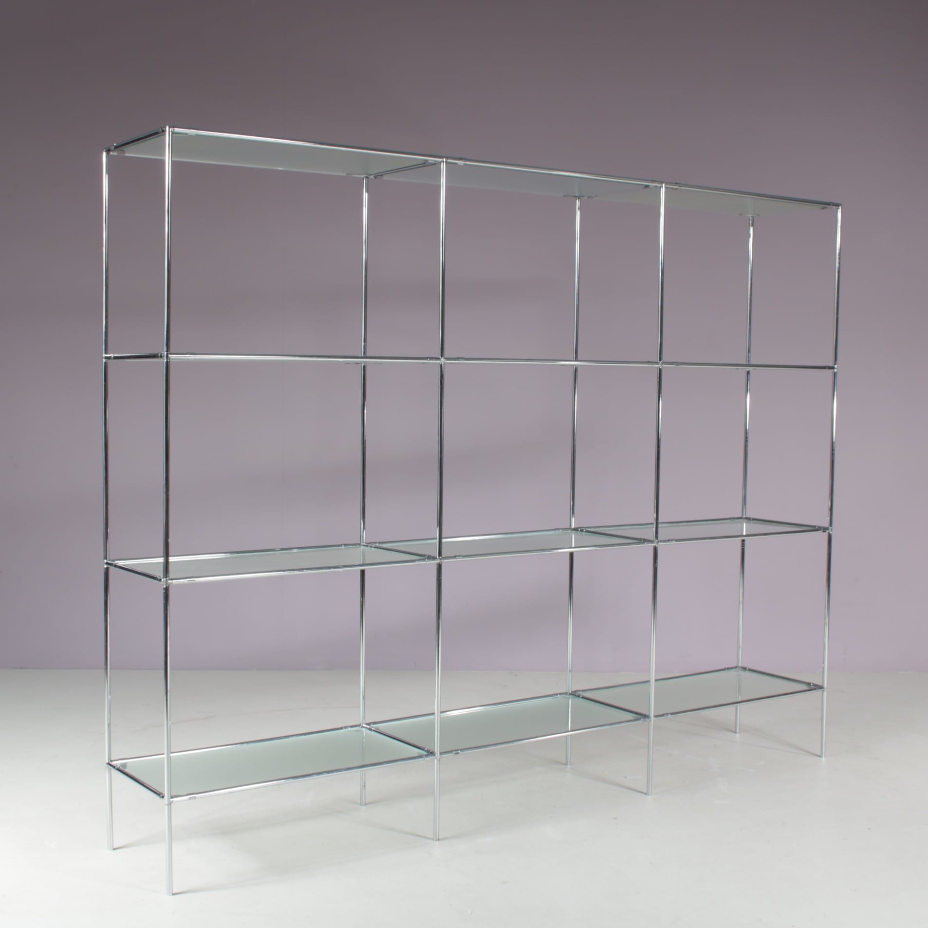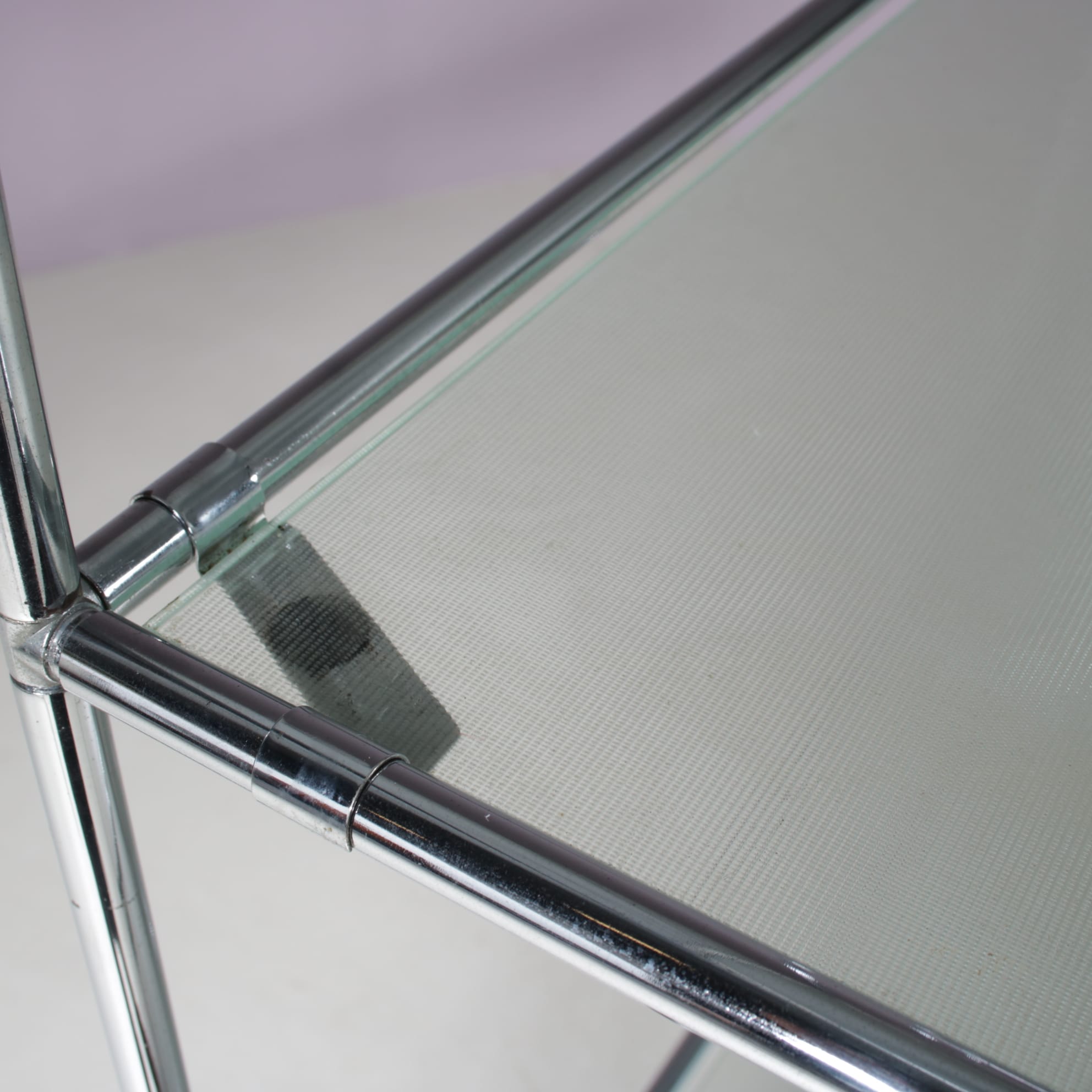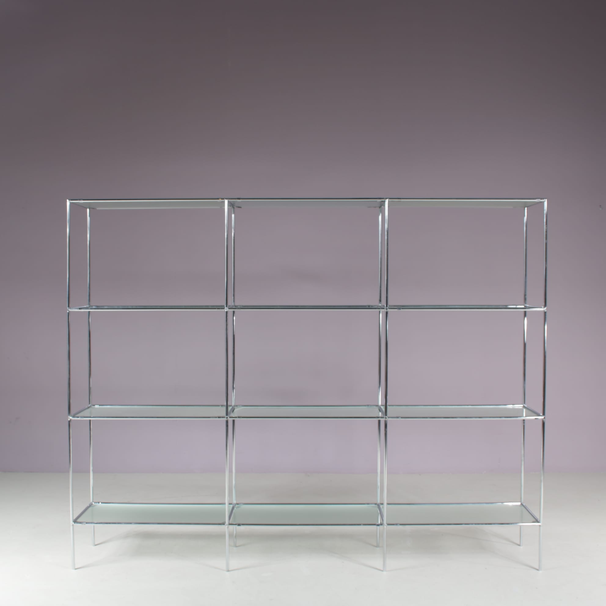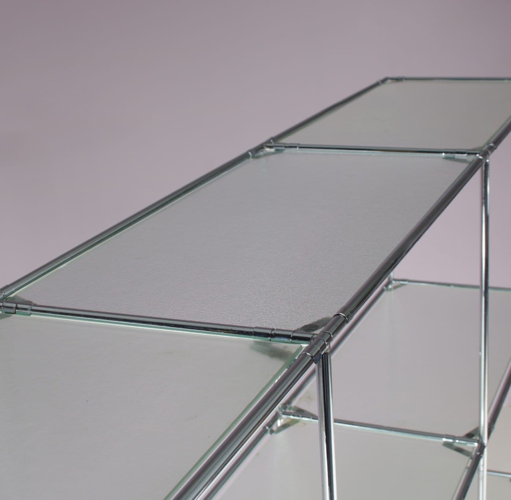 This elegant cabinet is made of high quality chrome plated metal. It has a thin, tubular metal frame with the connections in each corner allowing the piece to be built up and dissasemebled easily, but also be put in different settings and positions or even be extended with additional pieces. The blurred glass tops add nicely to it’s modern style and creates a sense of harmony to the overall design. It’s an iconic find of mid-century design that will allow for many different uses in different kinds of decors as a striking decorative piece, a storage unit or a display cabinet.