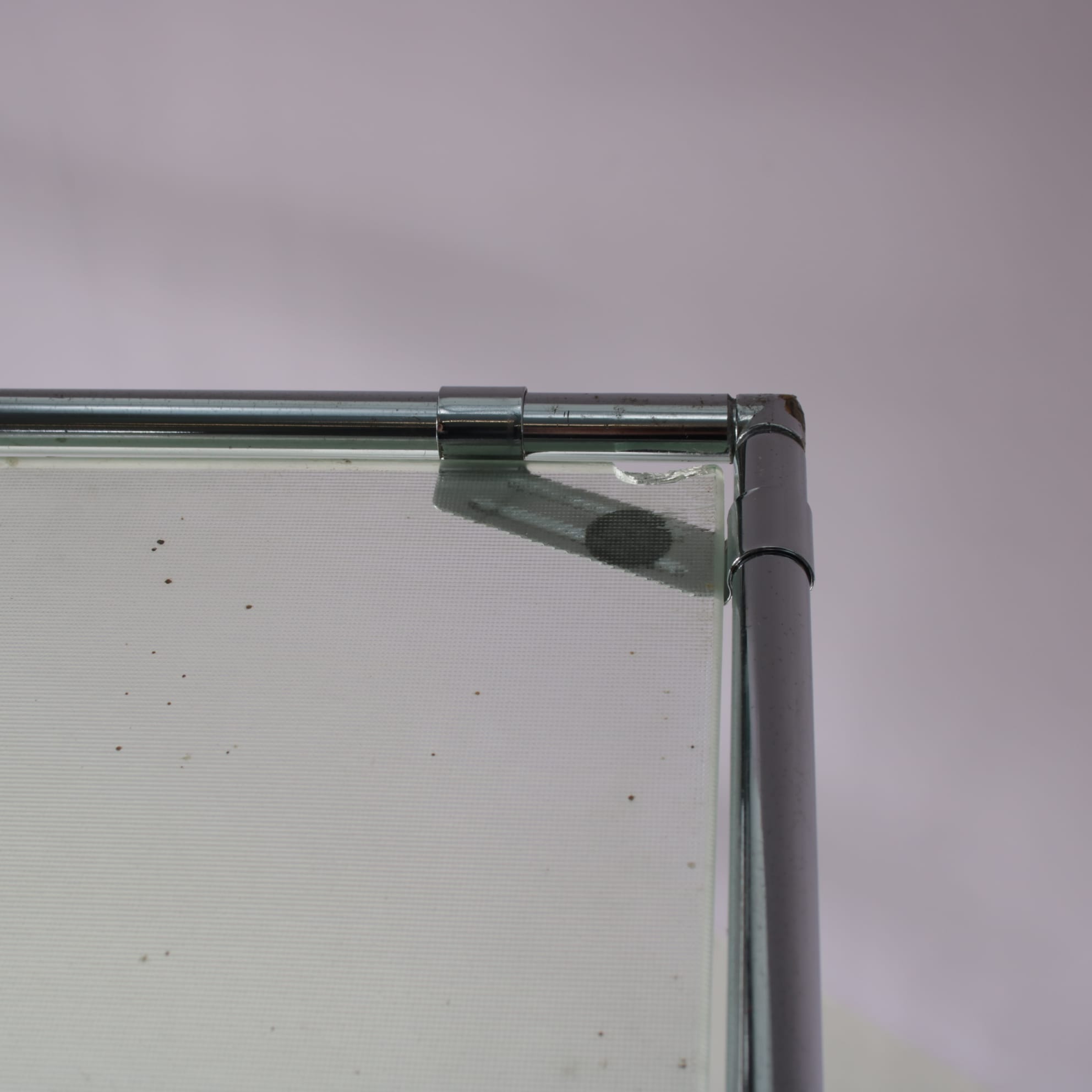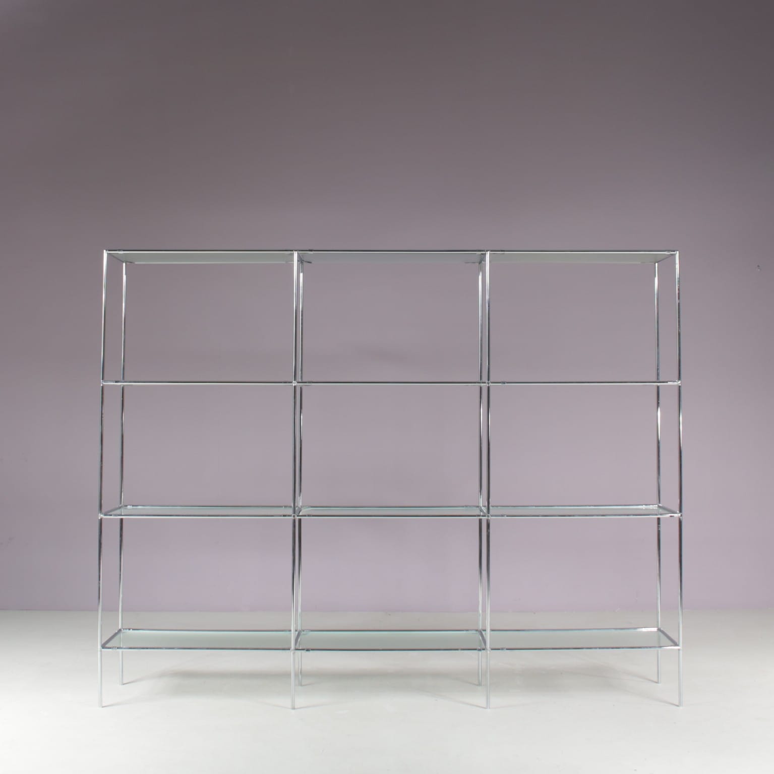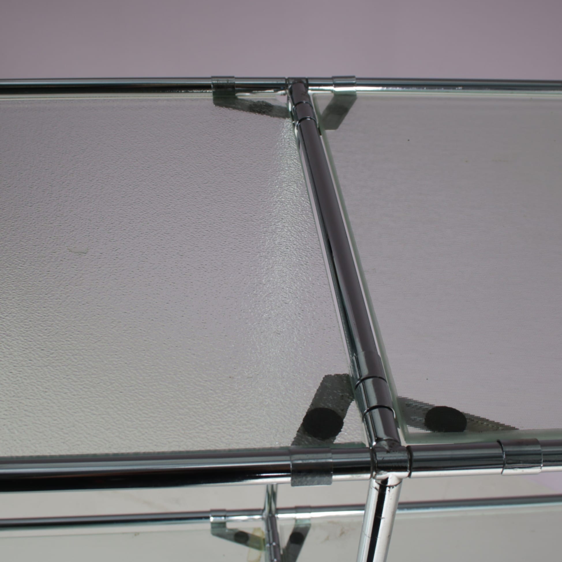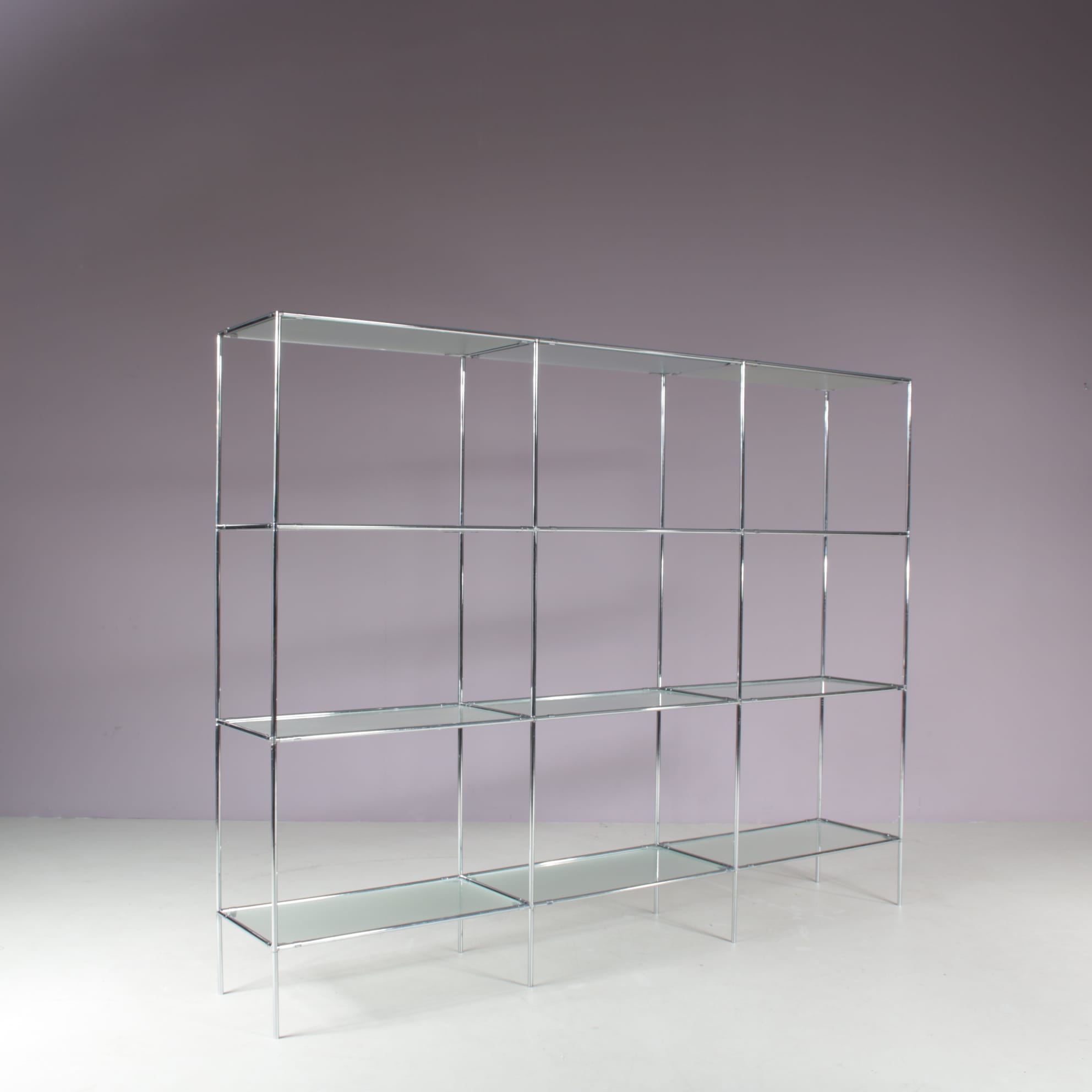 This elegant cabinet is made of high quality chrome plated metal. It has a thin, tubular metal frame with the connections in each corner allowing the piece to be built up and dissasemebled easily, but also be put in different settings and positions or even be extended with additional pieces. The blurred glass tops add nicely to it’s modern style and creates a sense of harmony to the overall design. It’s an iconic find of mid-century design that will allow for many different uses in different kinds of decors as a striking decorative piece, a storage unit or a display cabinet.