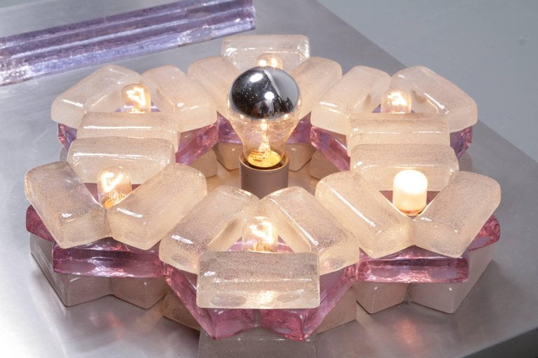 This rare lamp is made of a metal plate holding pieces of glass in different shapes and colors, giving it the eye-catching artistic style that Poliarte is famously known form. It holds a total of seven-light bulbs, creating a beautiful effect when lit. This lamp would make a wonderful addition to any interior, being a lamp and art piece in one!