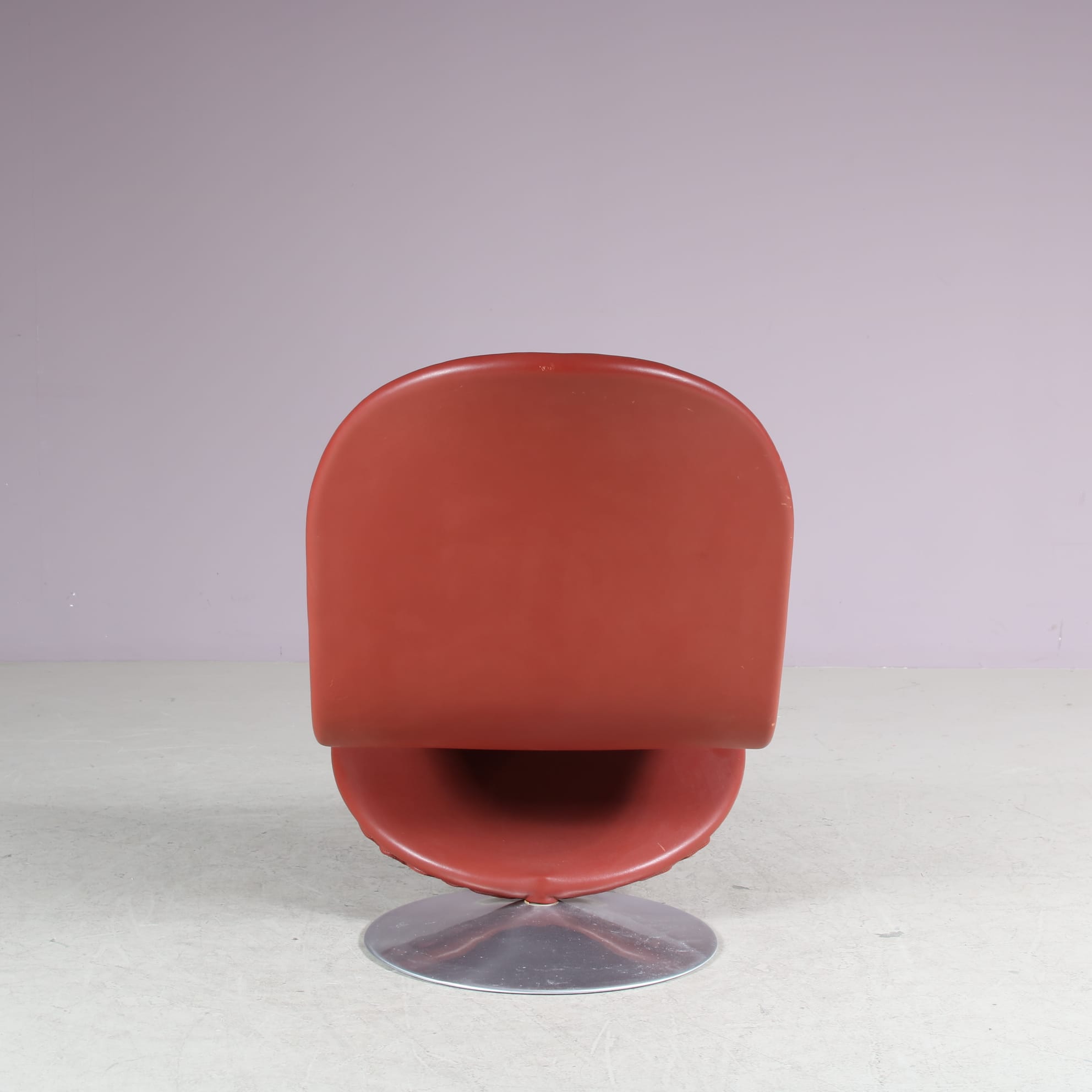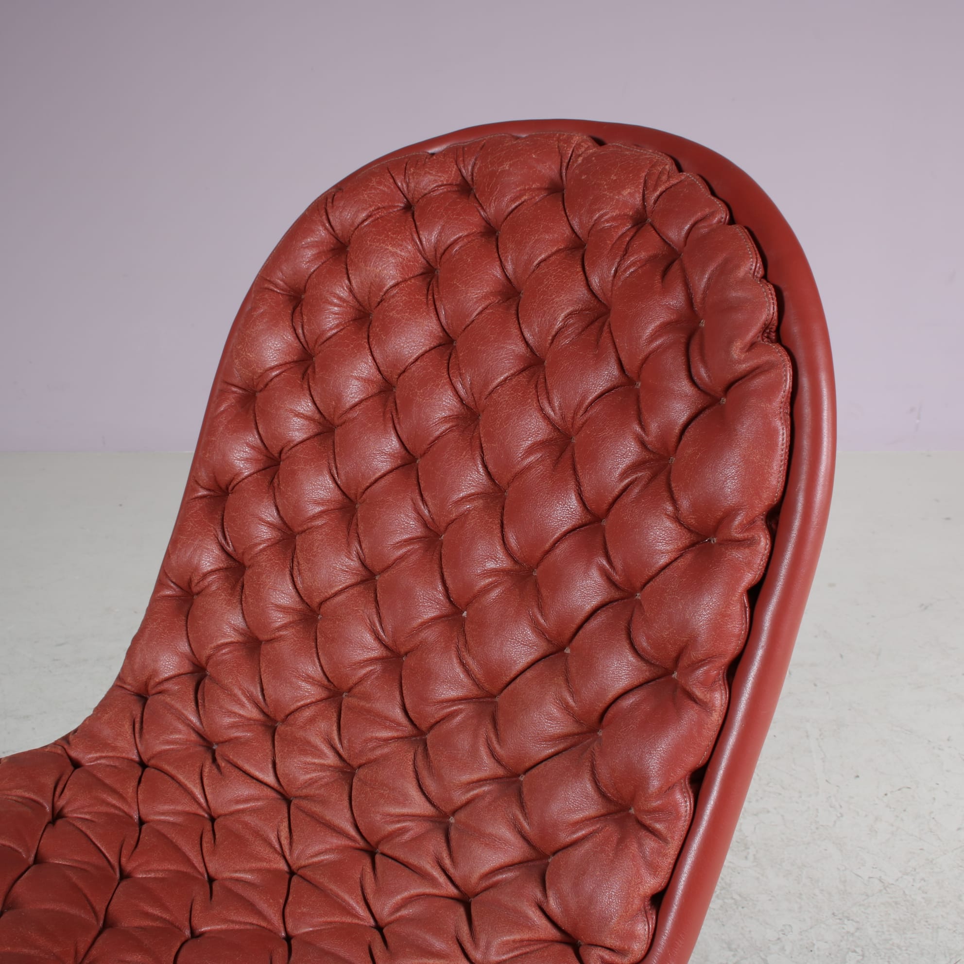 It has a round aluminum metal base and beautiful tufted brick red leather upholstery of impressive quality. These materials and colours contrast very nicely to each other, giving this chair the eye-catching appearance that earned it a spot in the history of furniture design! It’s curved shape provides comfort, beauty and elegance.