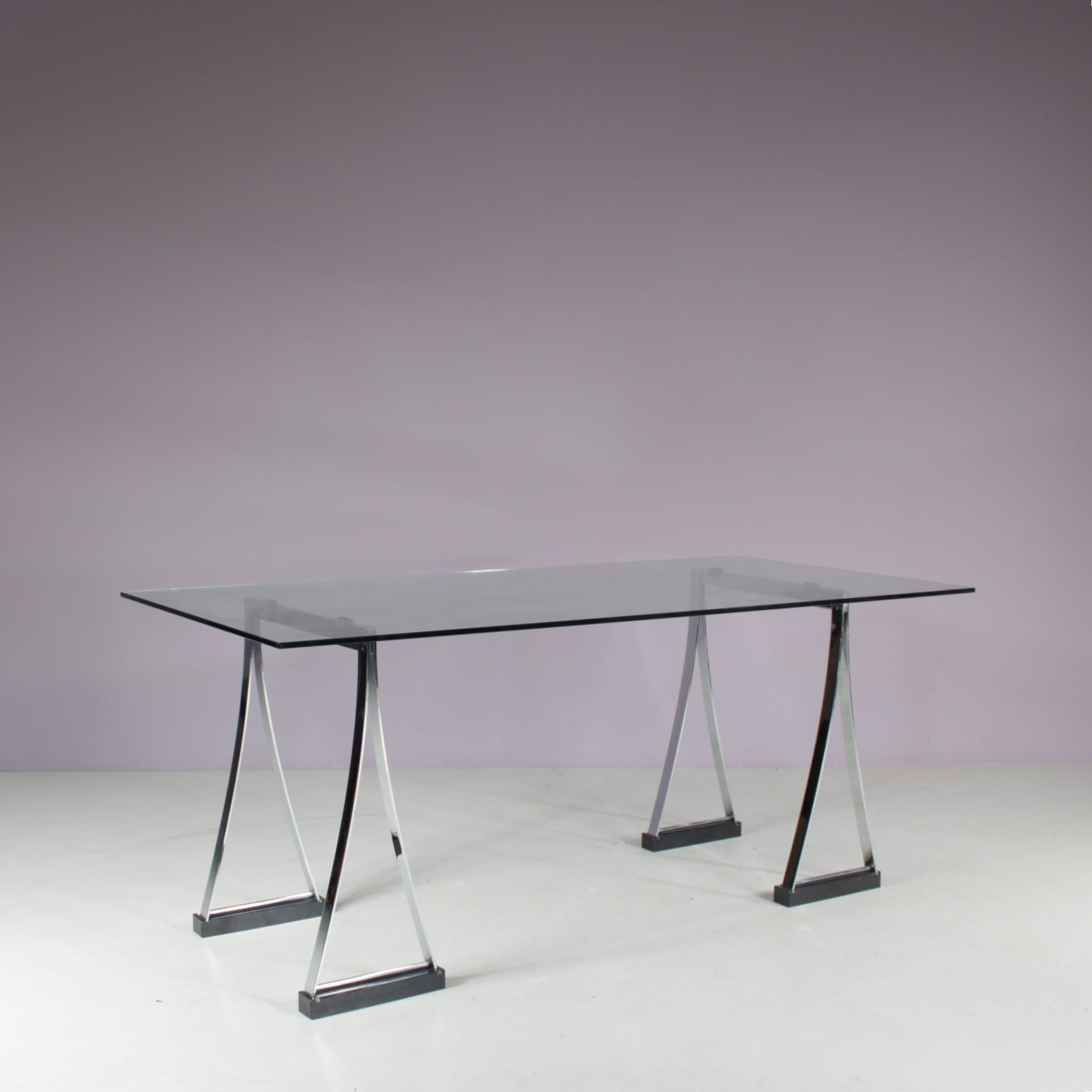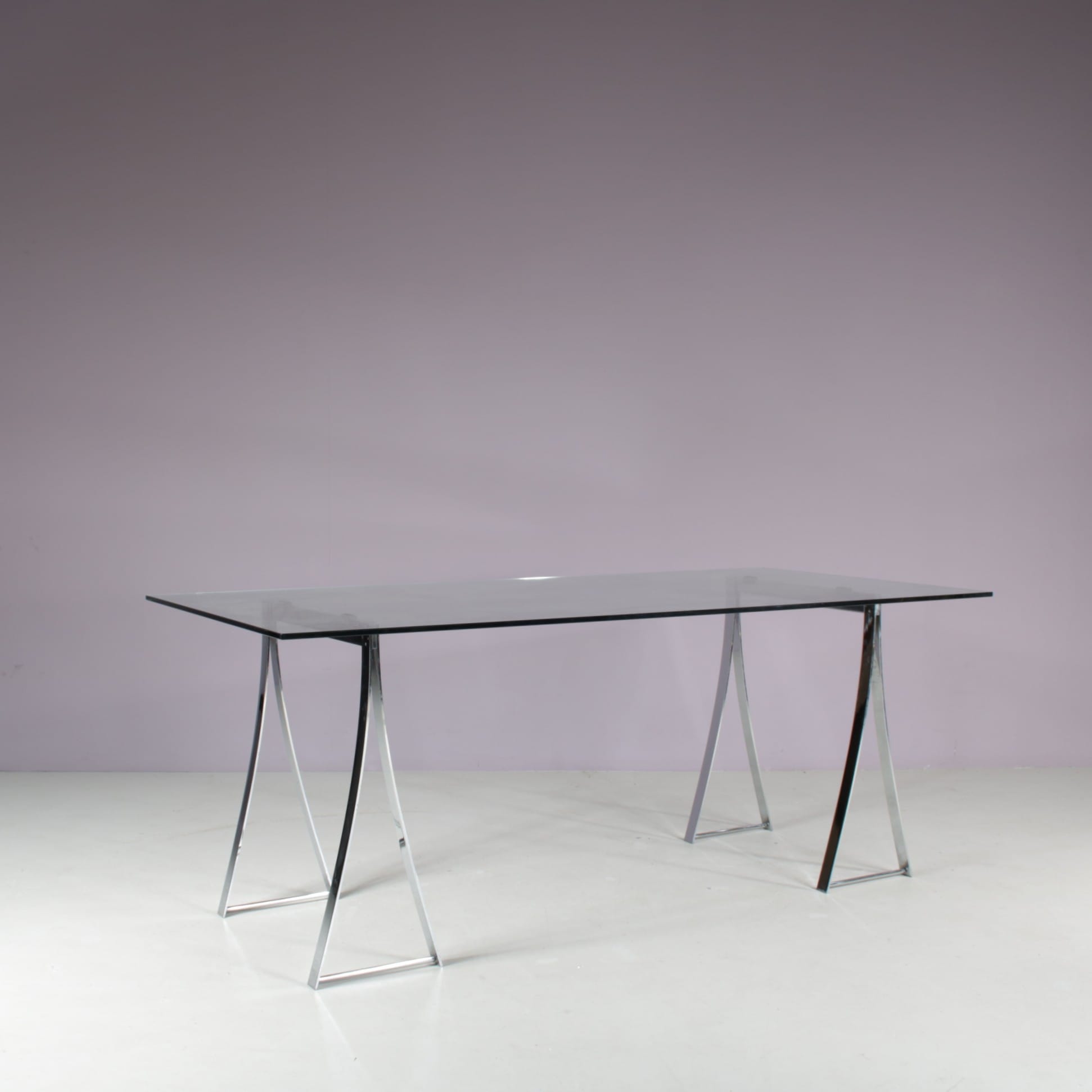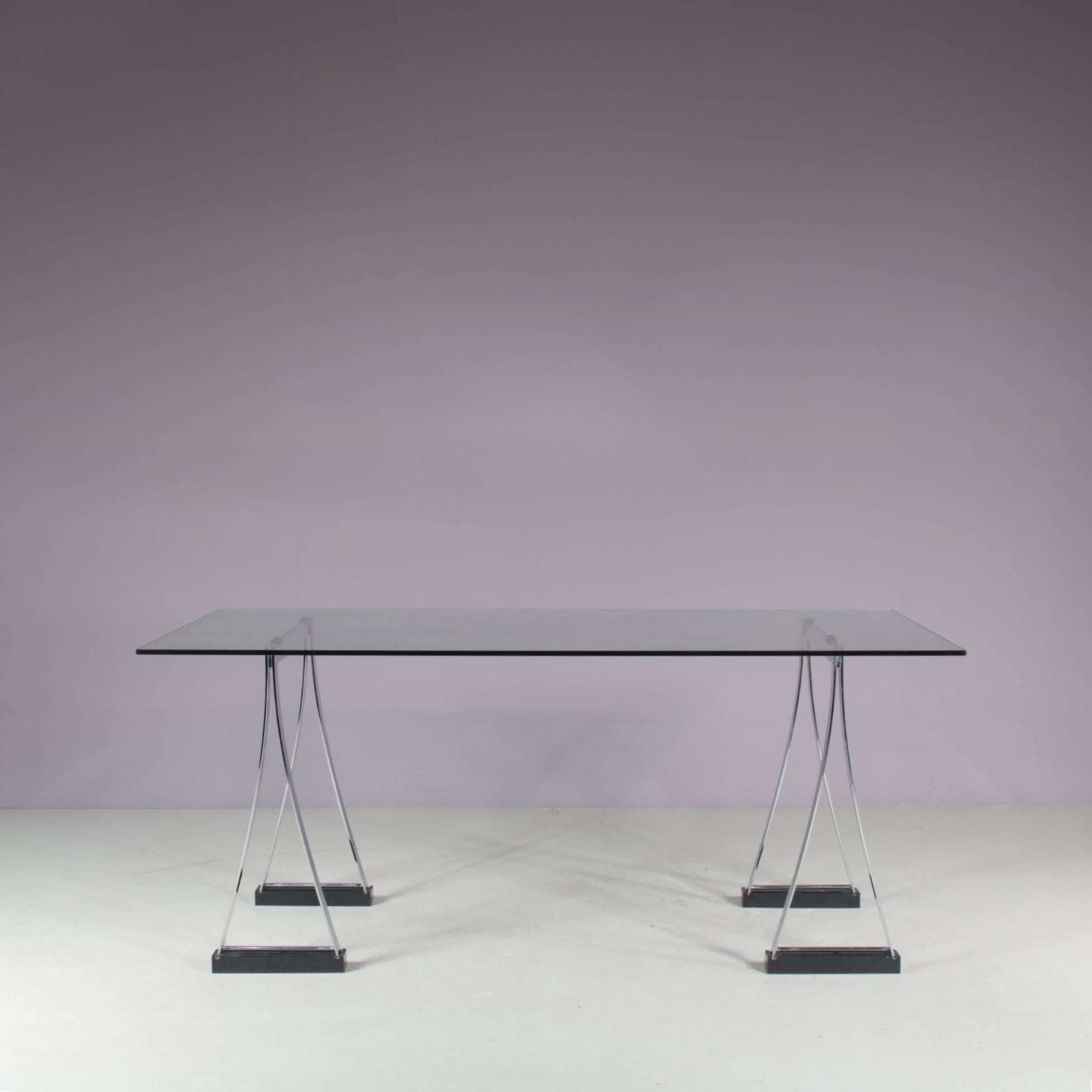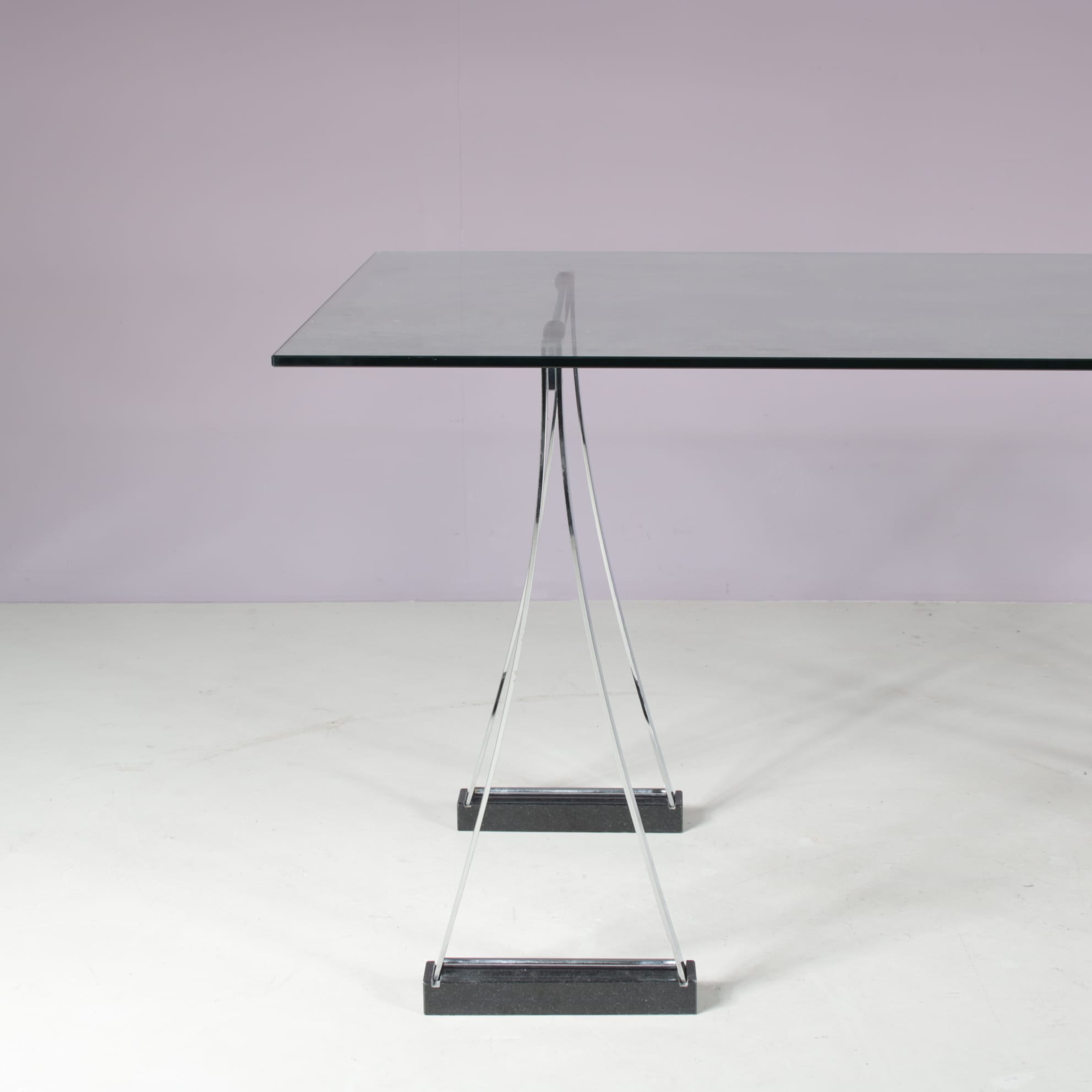 This beautiful piece has a nice, minimalist design. The trestle base contains two chrome plated metal parts with two legs and a support bar each. The straight legs are gently curved which adds an elegant touch to it’s design. Together they hold a rectangular, clear glass top which is very fitting for it’s design! The legs are supported by black marble feet, which are optional. They can also be removed for a more clean finish, fitting whatever the sitaution desires. When the marble feet are removed, the table height drops down to 73 cm. Overall this is a fantastic piece of mid-century design that will definitely draw the attention in the interior or office space!