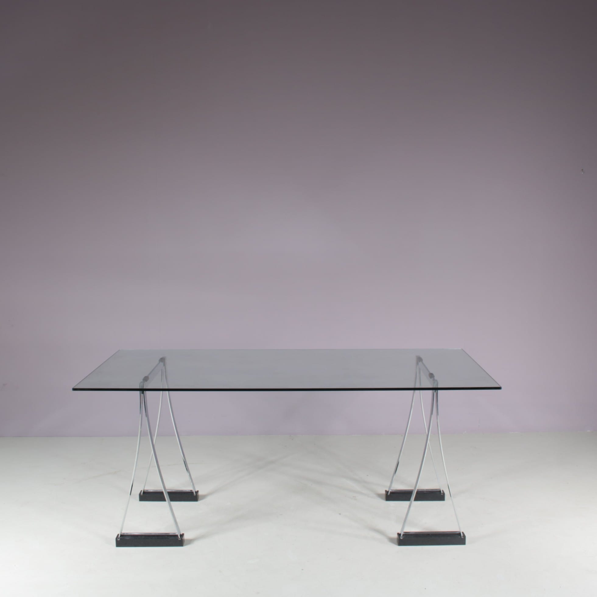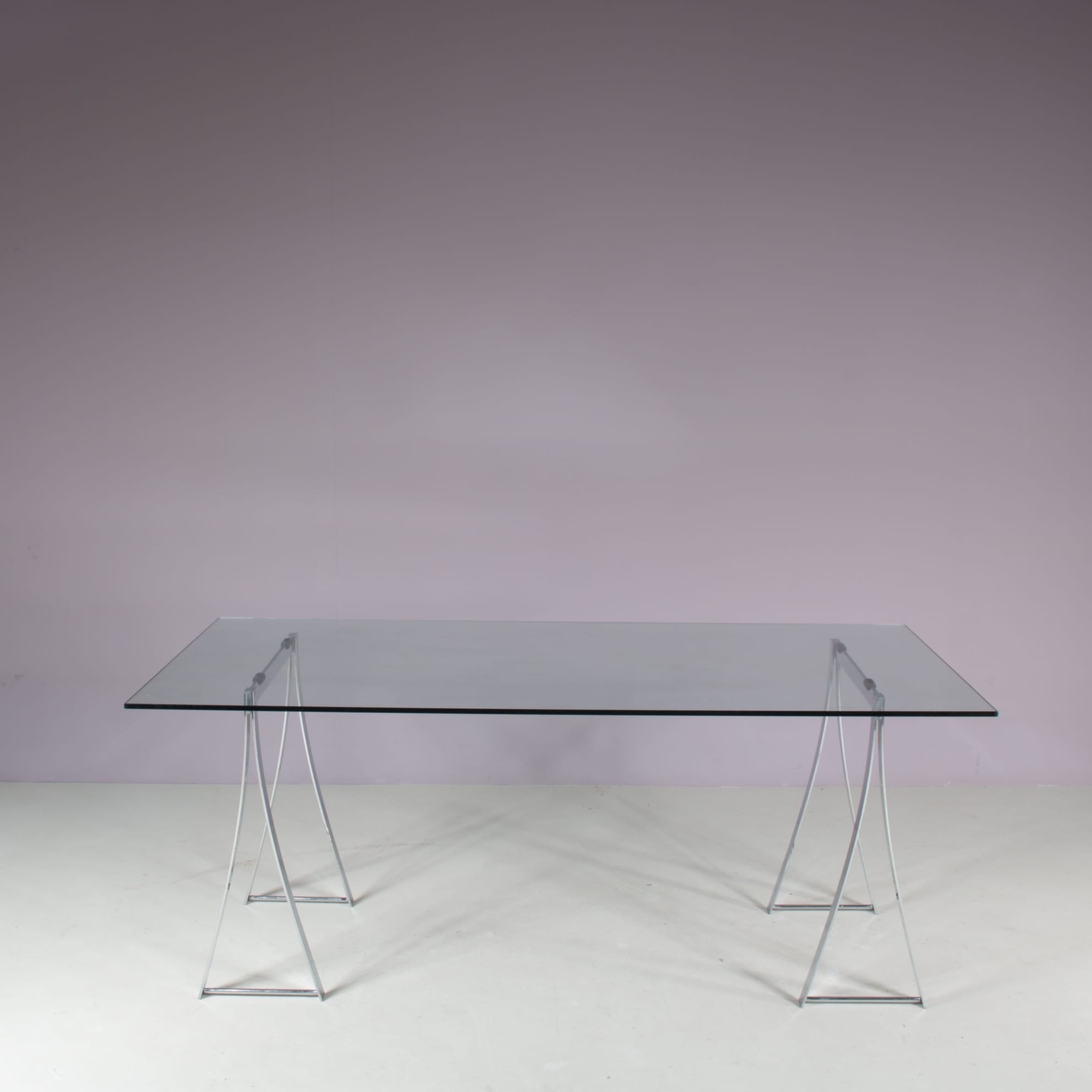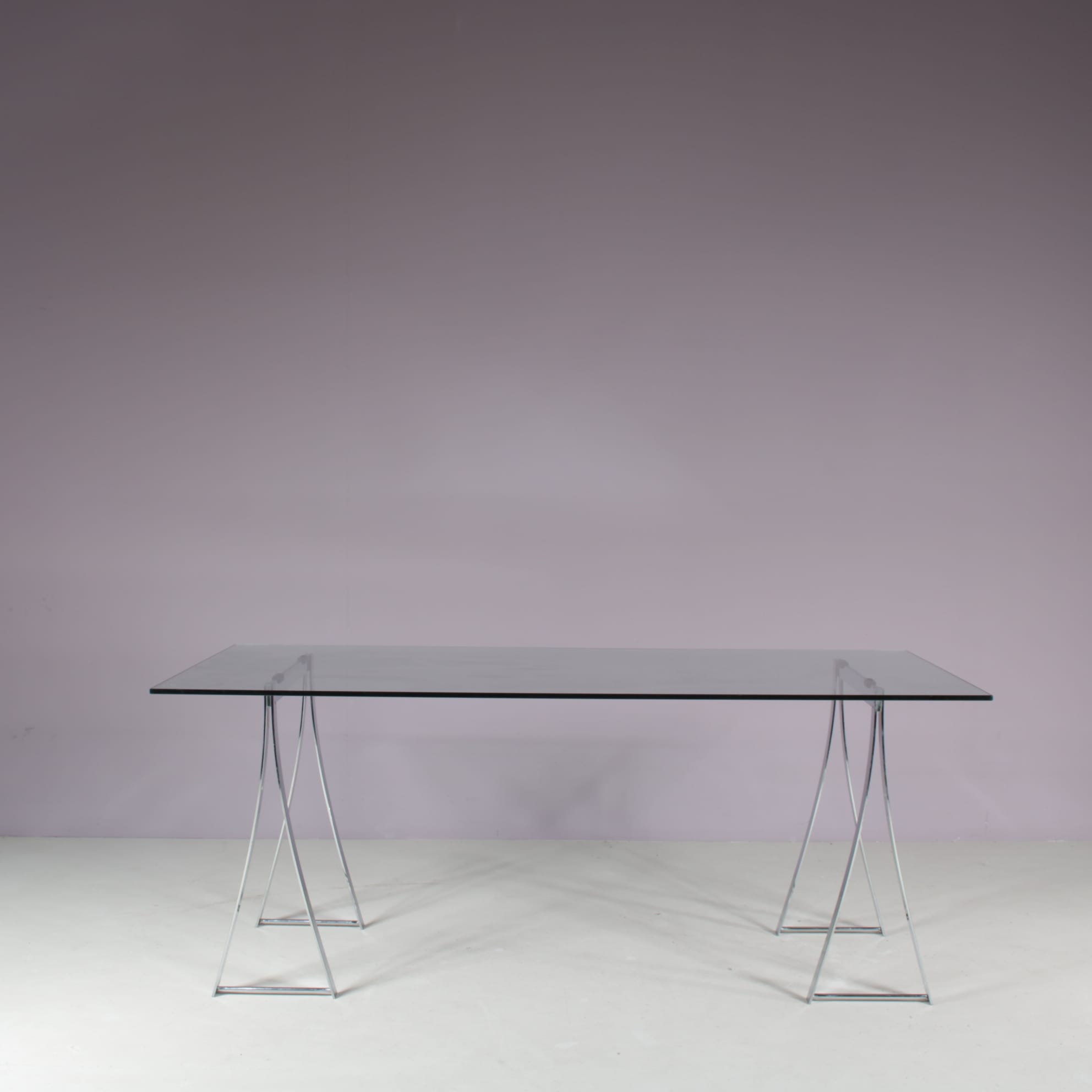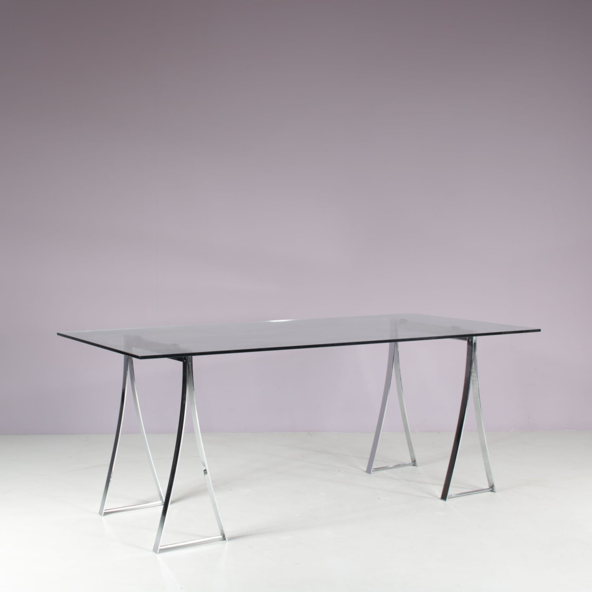 This beautiful piece has a nice, minimalist design. The trestle base contains two chrome plated metal parts with two legs and a support bar each. The straight legs are gently curved which adds an elegant touch to it’s design. Together they hold a rectangular, clear glass top which is very fitting for it’s design! The legs are supported by black marble feet, which are optional. They can also be removed for a more clean finish, fitting whatever the sitaution desires. When the marble feet are removed, the table height drops down to 73 cm. Overall this is a fantastic piece of mid-century design that will definitely draw the attention in the interior or office space!