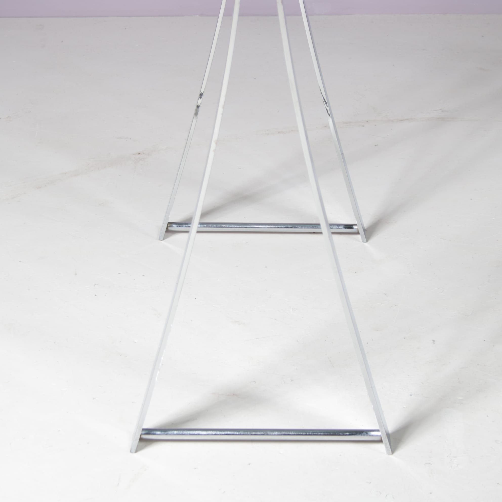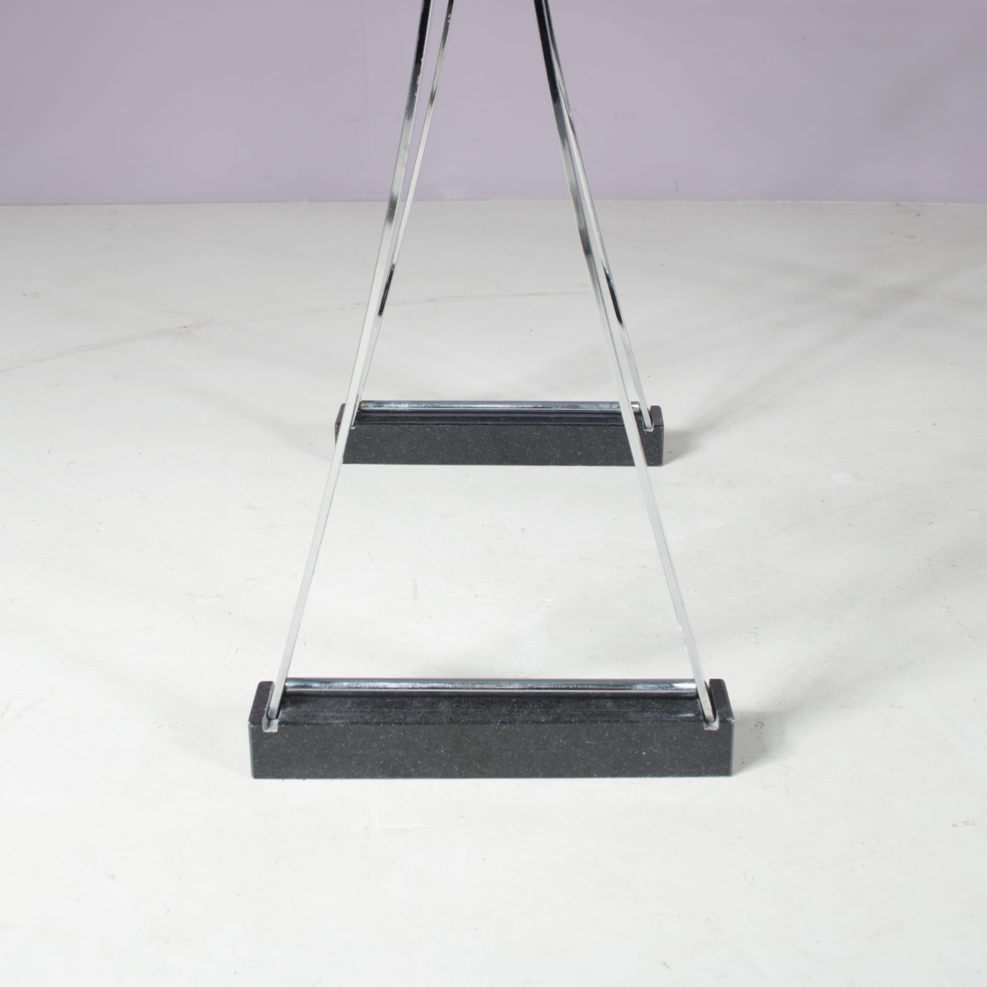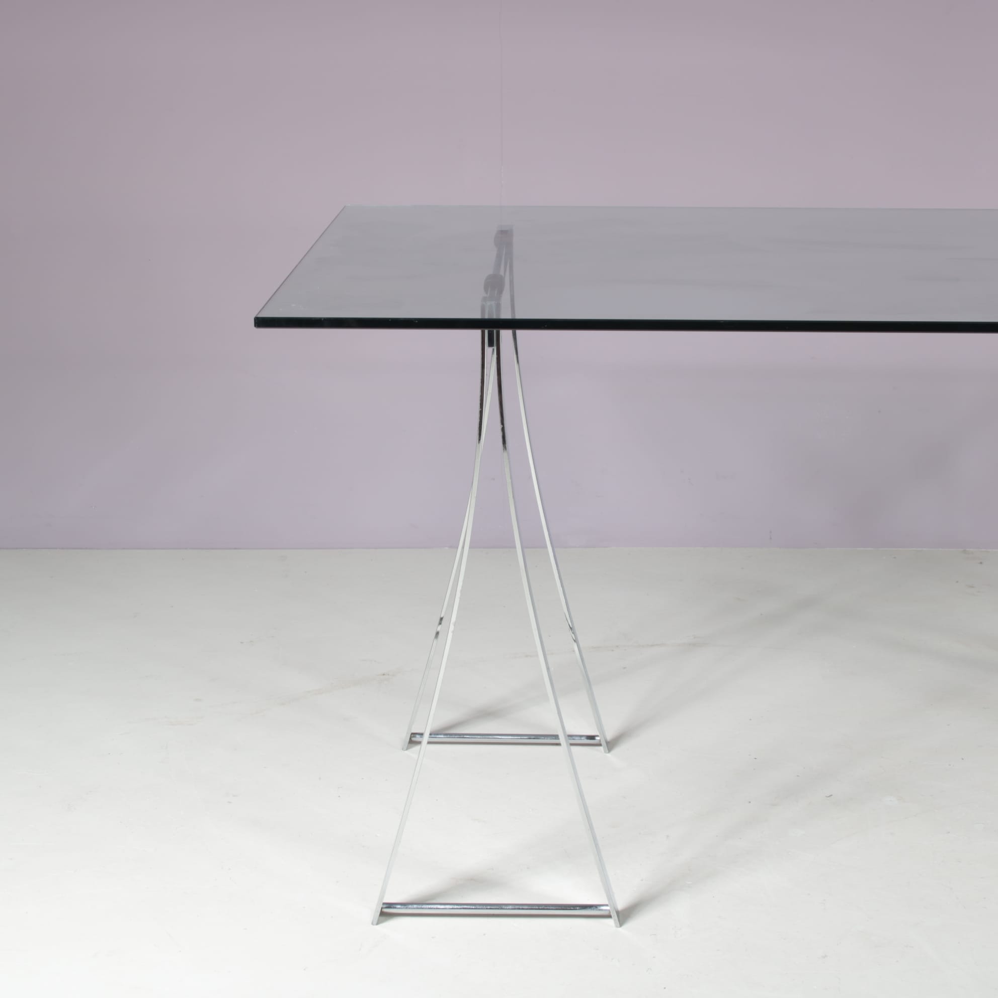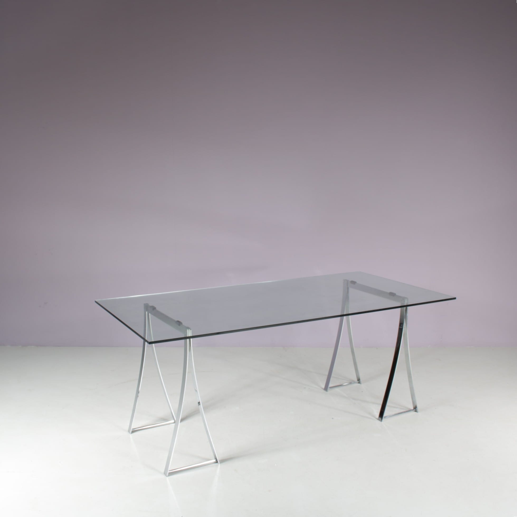 This beautiful piece has a nice, minimalist design. The trestle base contains two chrome plated metal parts with two legs and a support bar each. The straight legs are gently curved which adds an elegant touch to it’s design. Together they hold a rectangular, clear glass top which is very fitting for it’s design! The legs are supported by black marble feet, which are optional. They can also be removed for a more clean finish, fitting whatever the sitaution desires. When the marble feet are removed, the table height drops down to 73 cm. Overall this is a fantastic piece of mid-century design that will definitely draw the attention in the interior or office space!