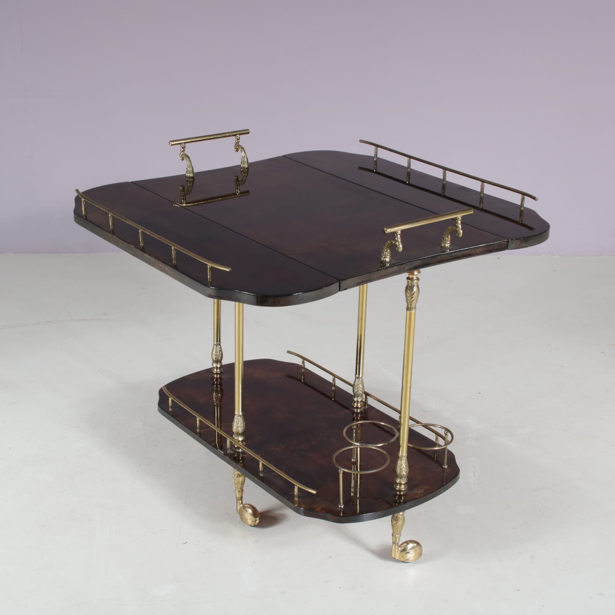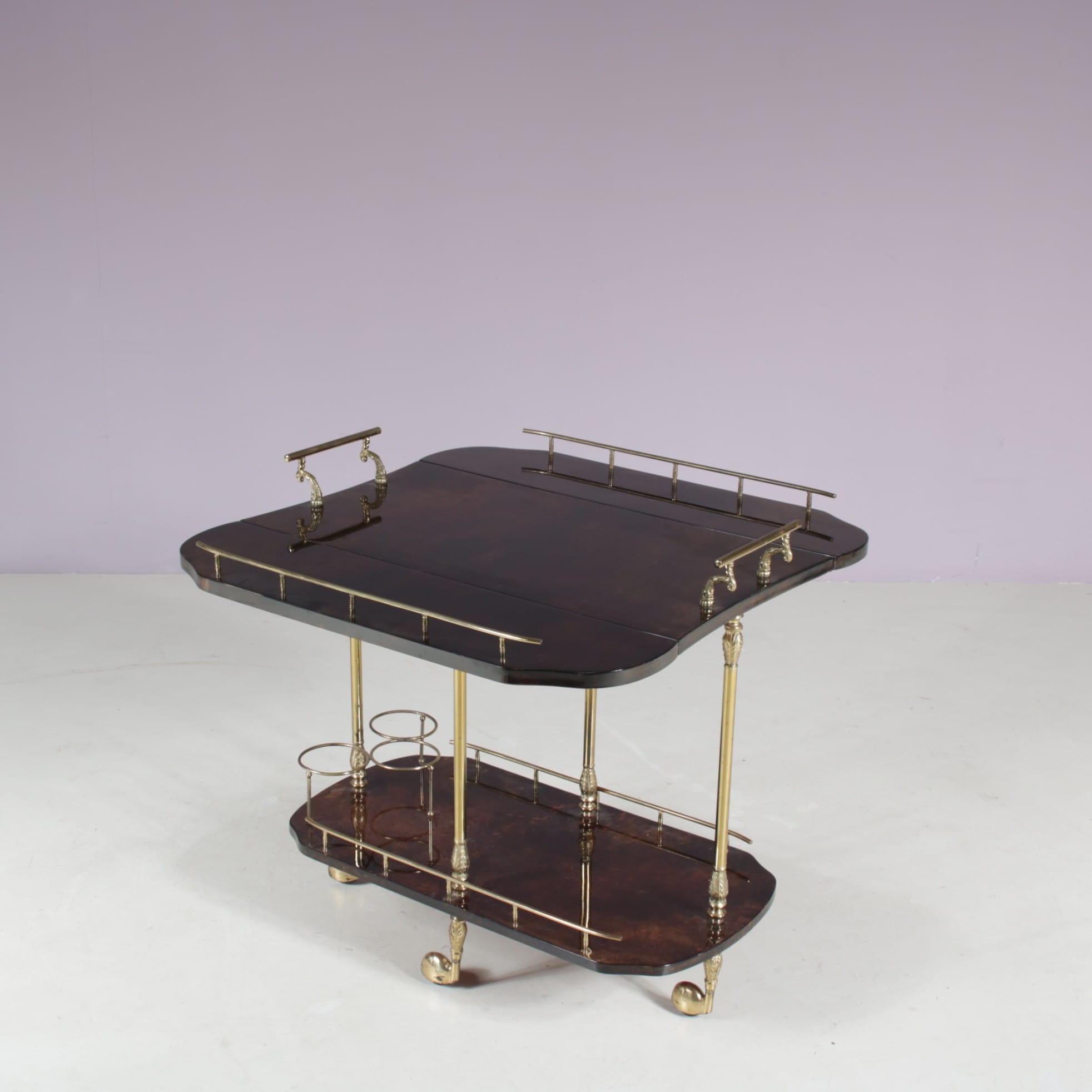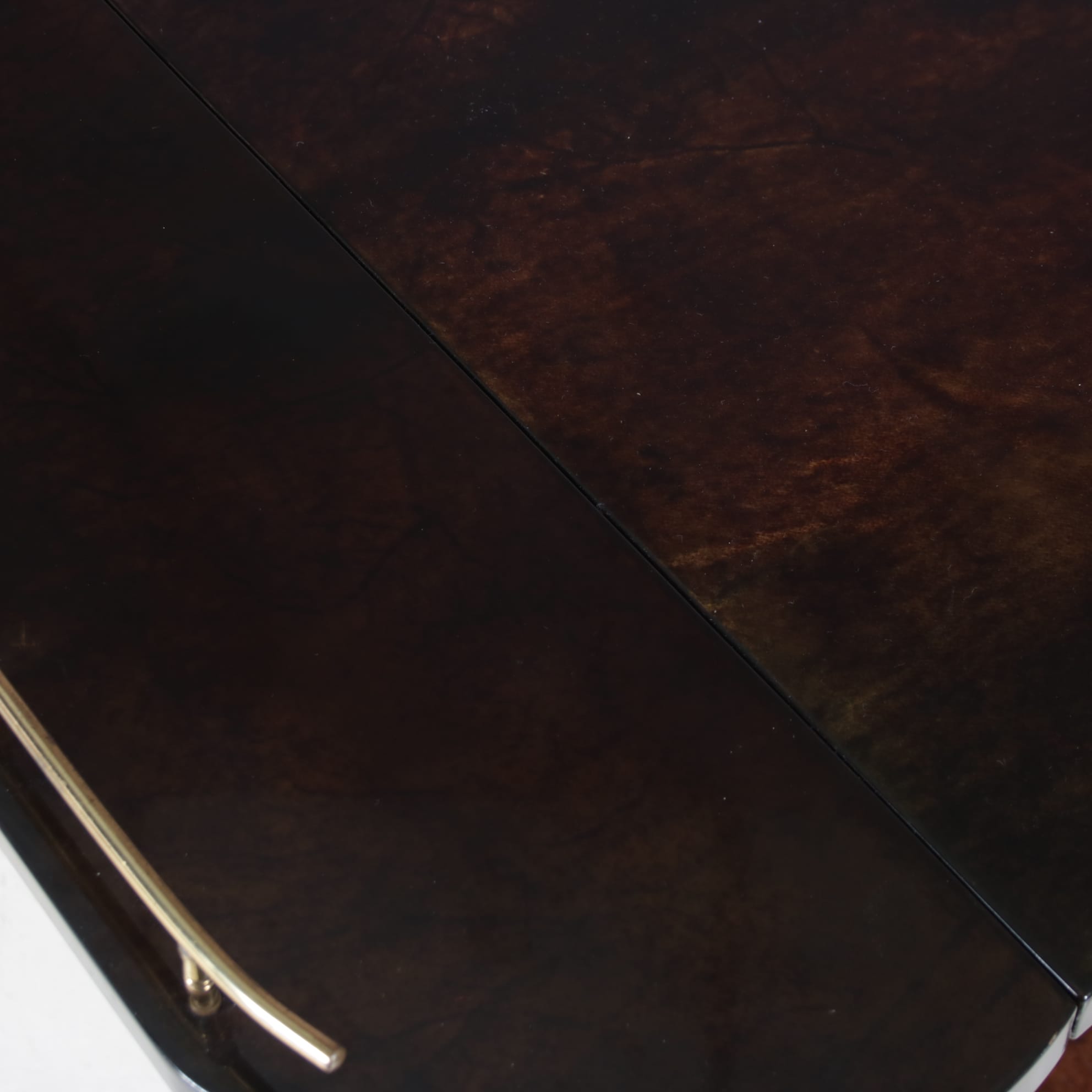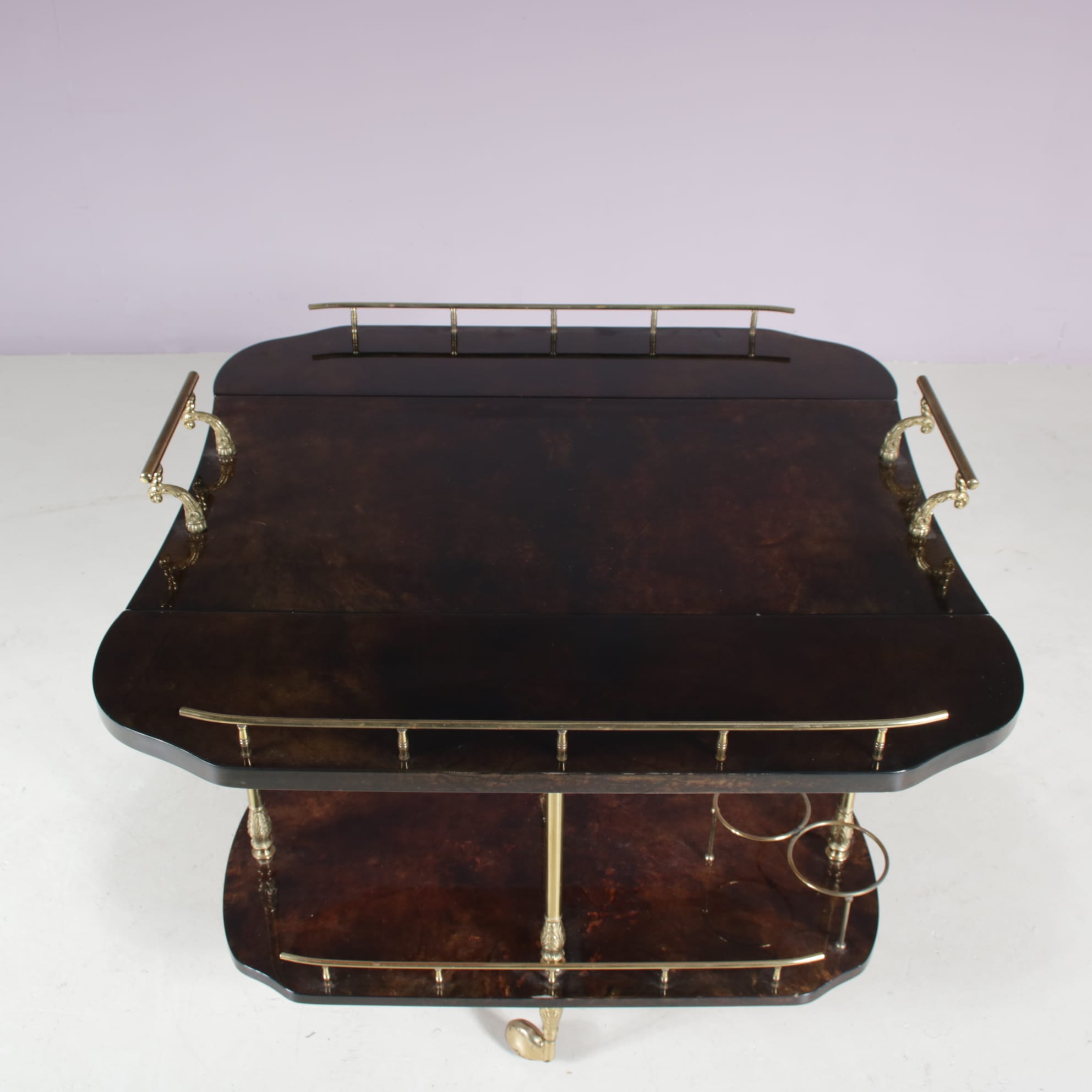 m28143 1960s Bar cart with drop leaves in lacquered goat skin with brass base Aldo Tura Italy