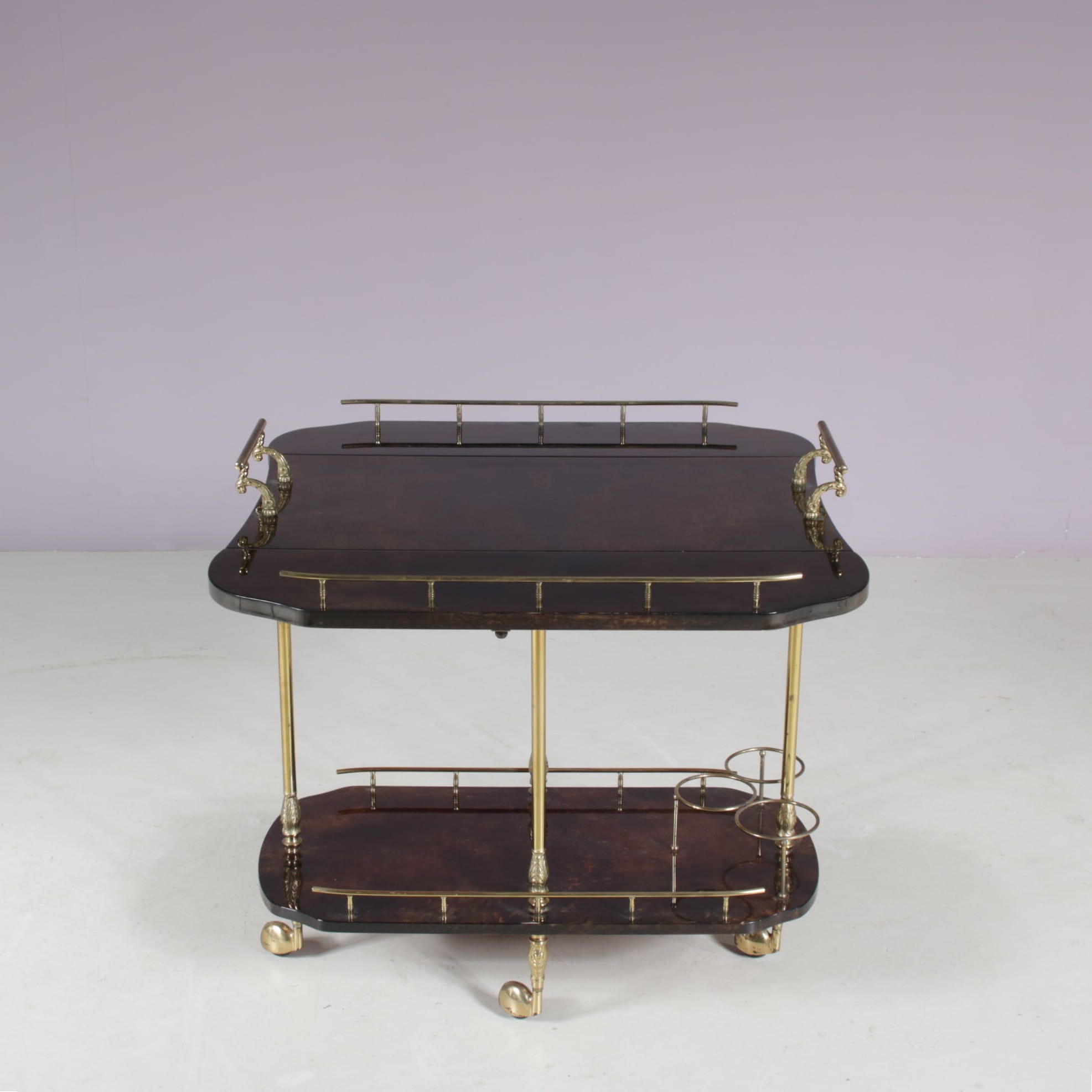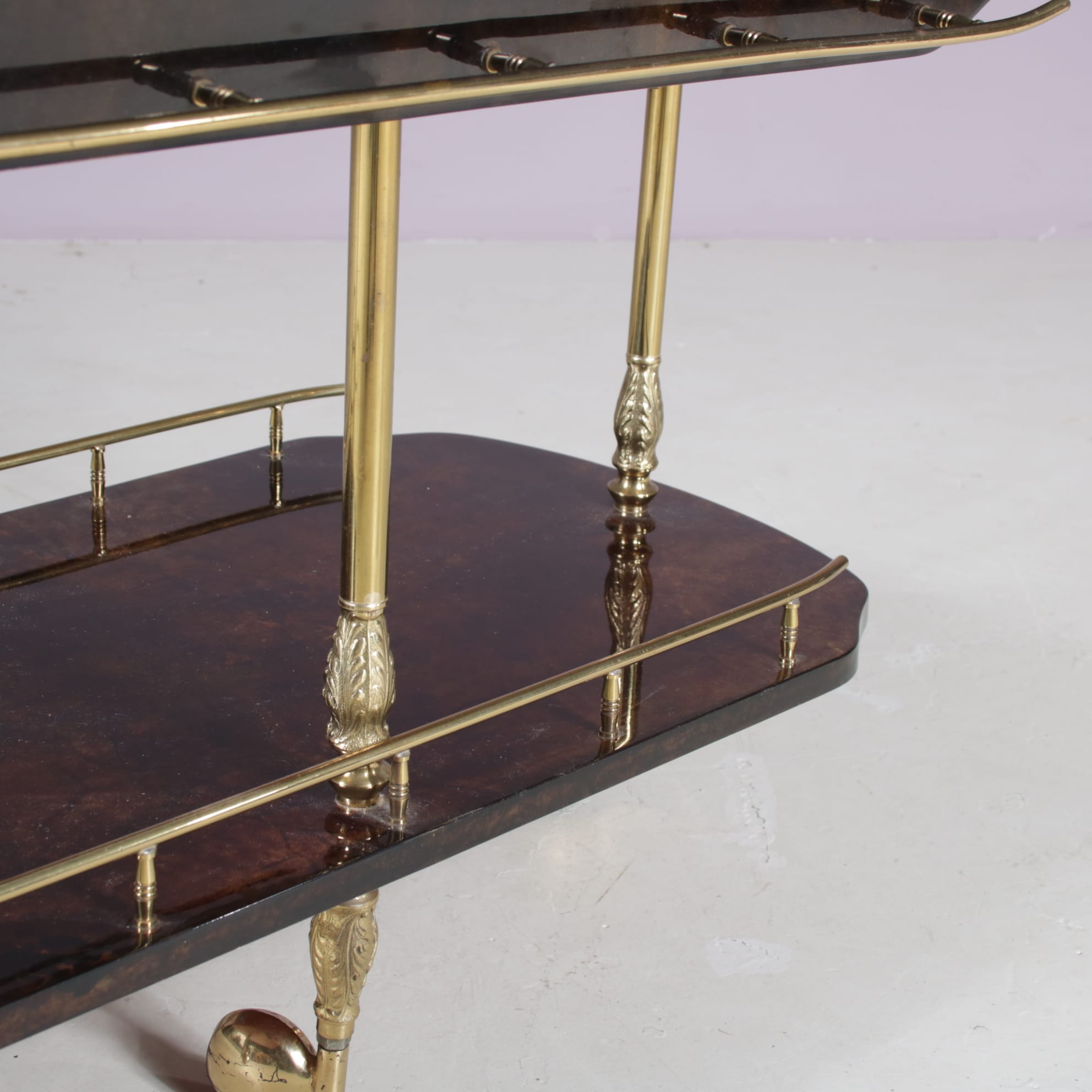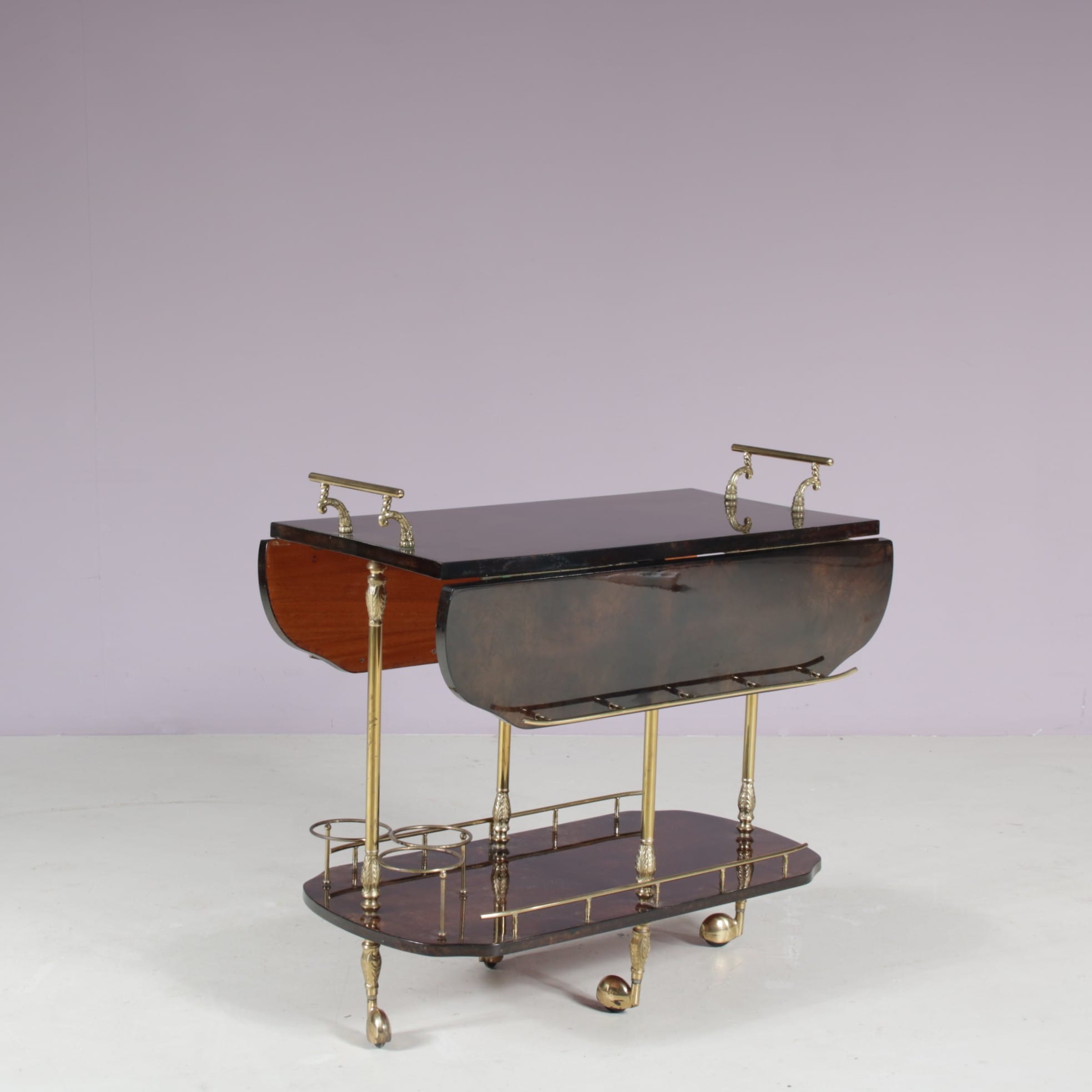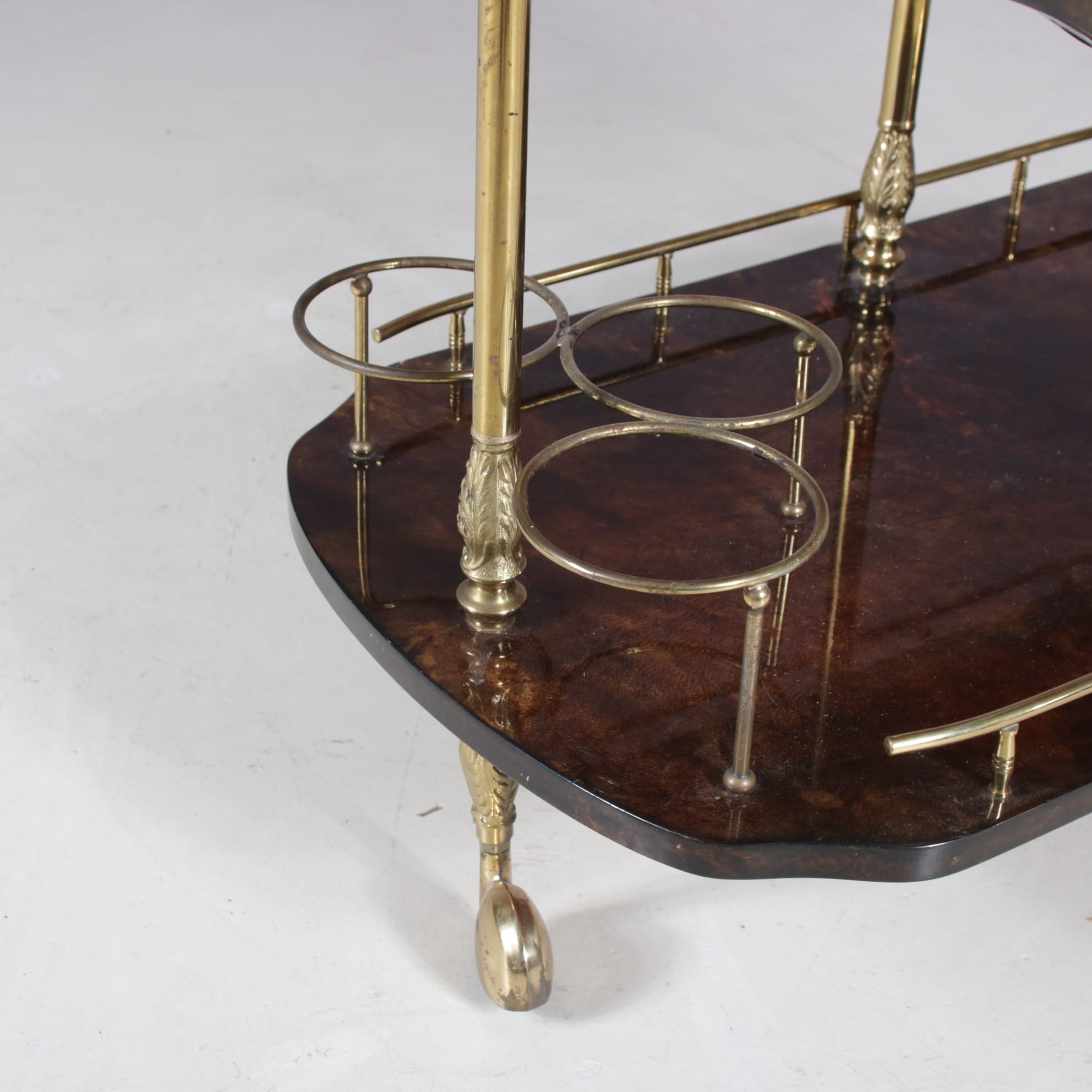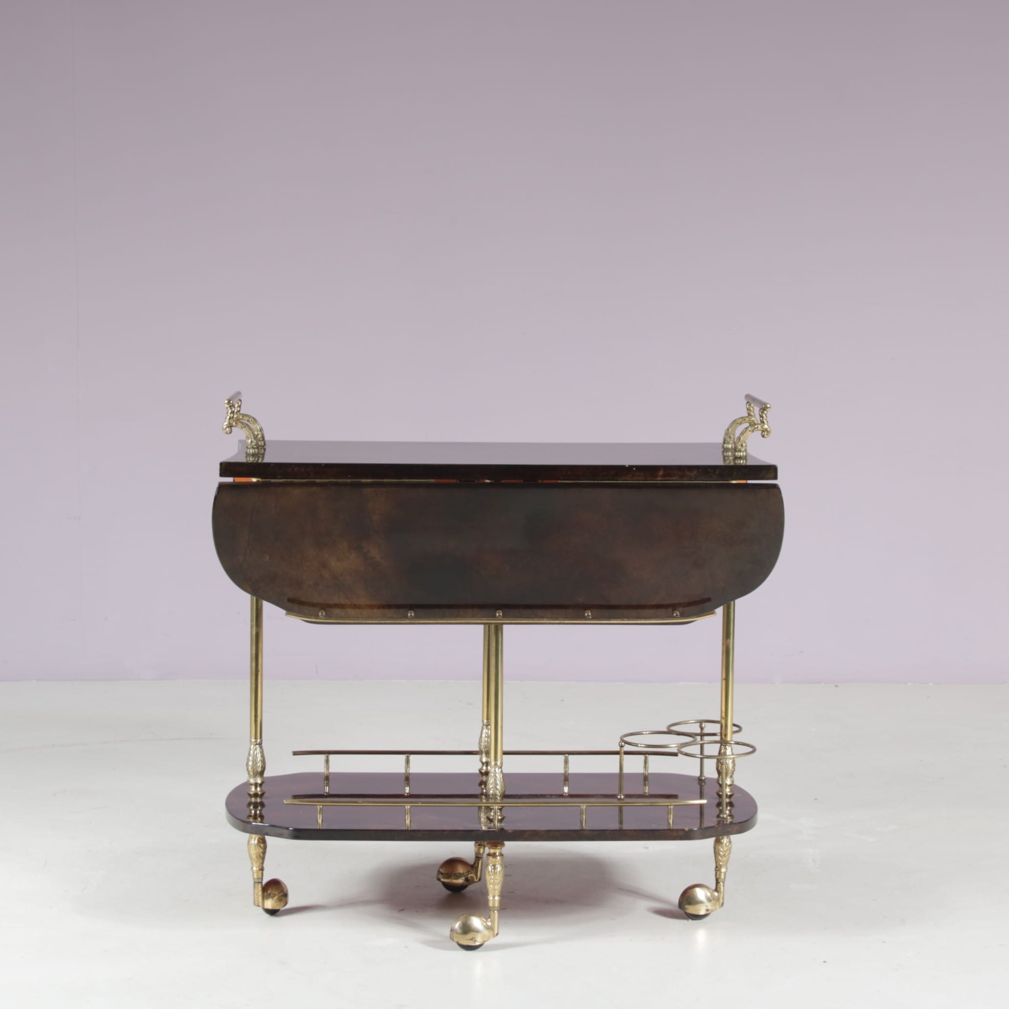 m28143 1960s Bar cart with drop leaves in lacquered goat skin with brass base Aldo Tura Italy