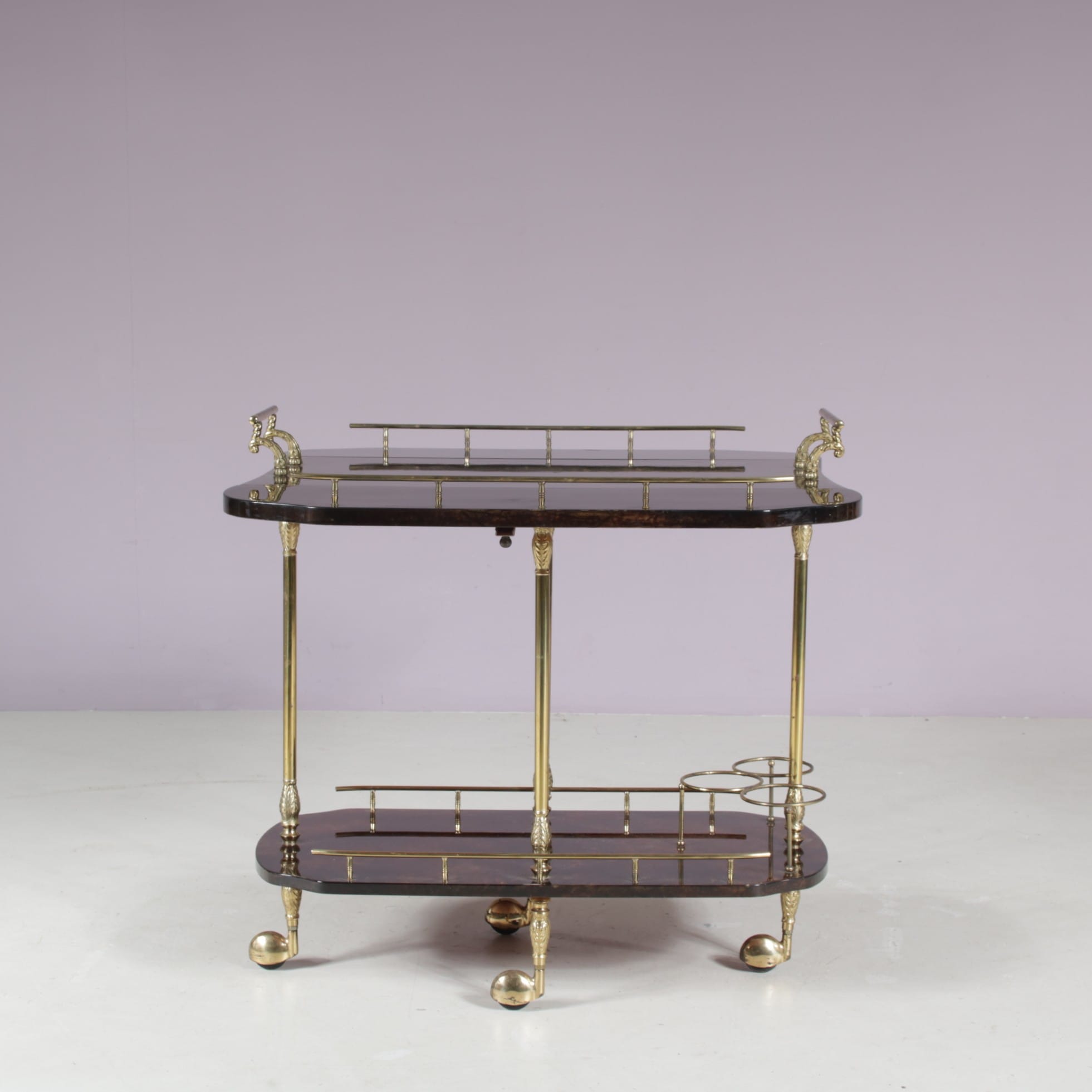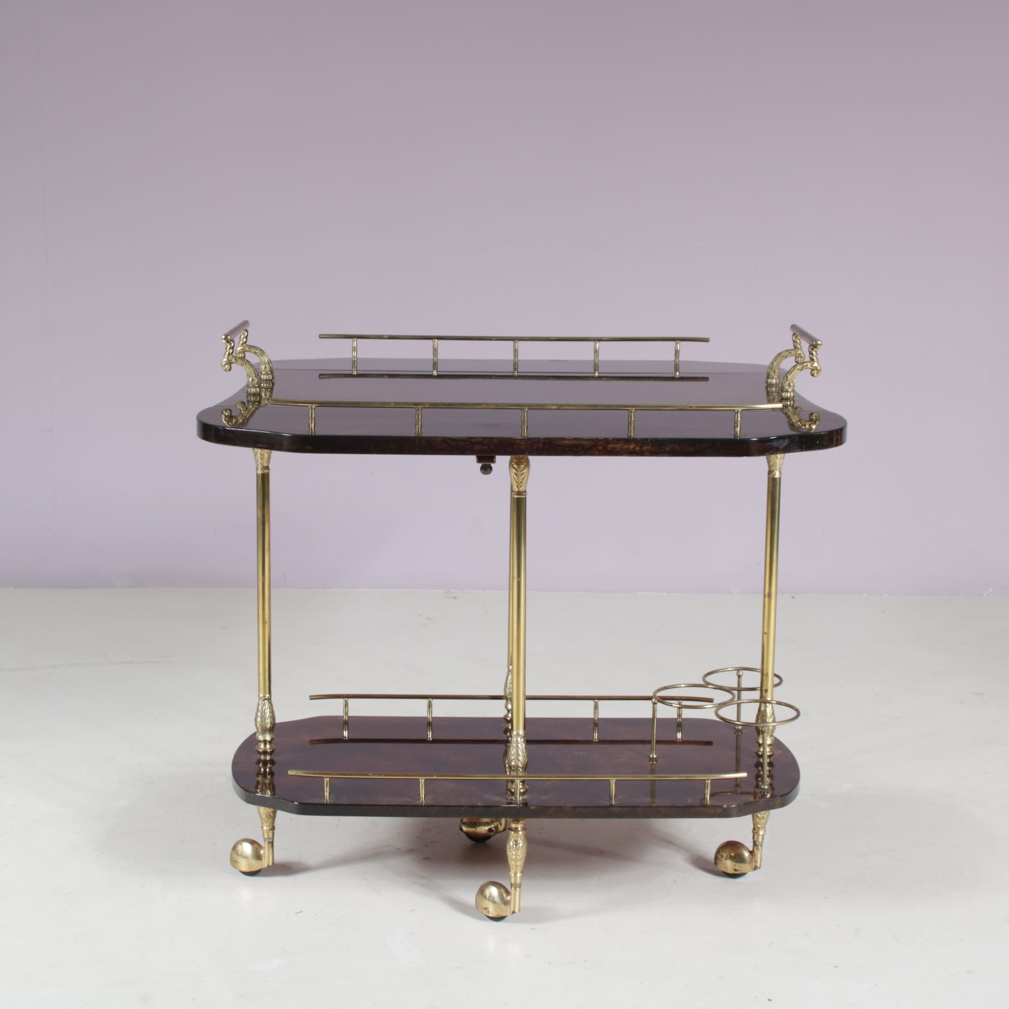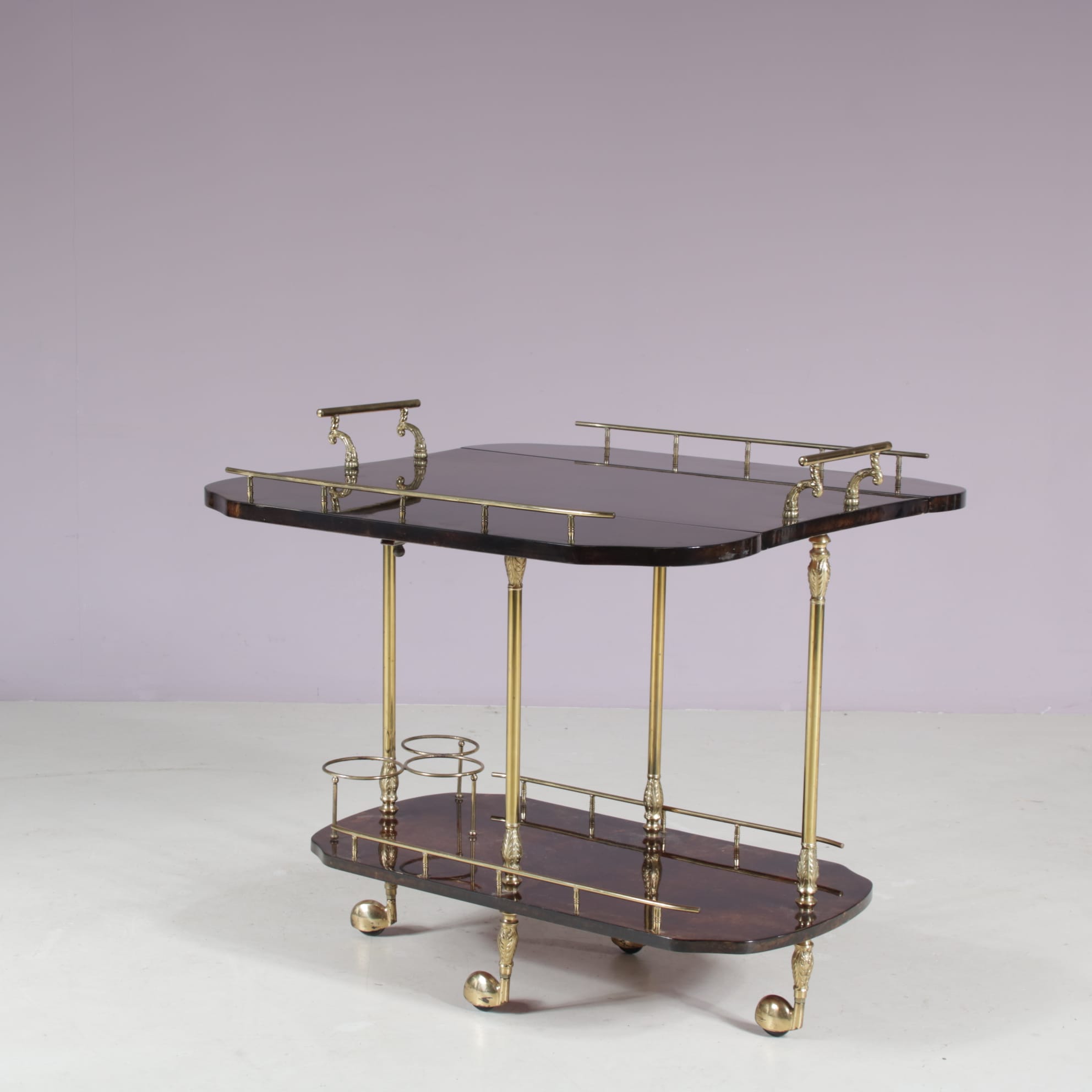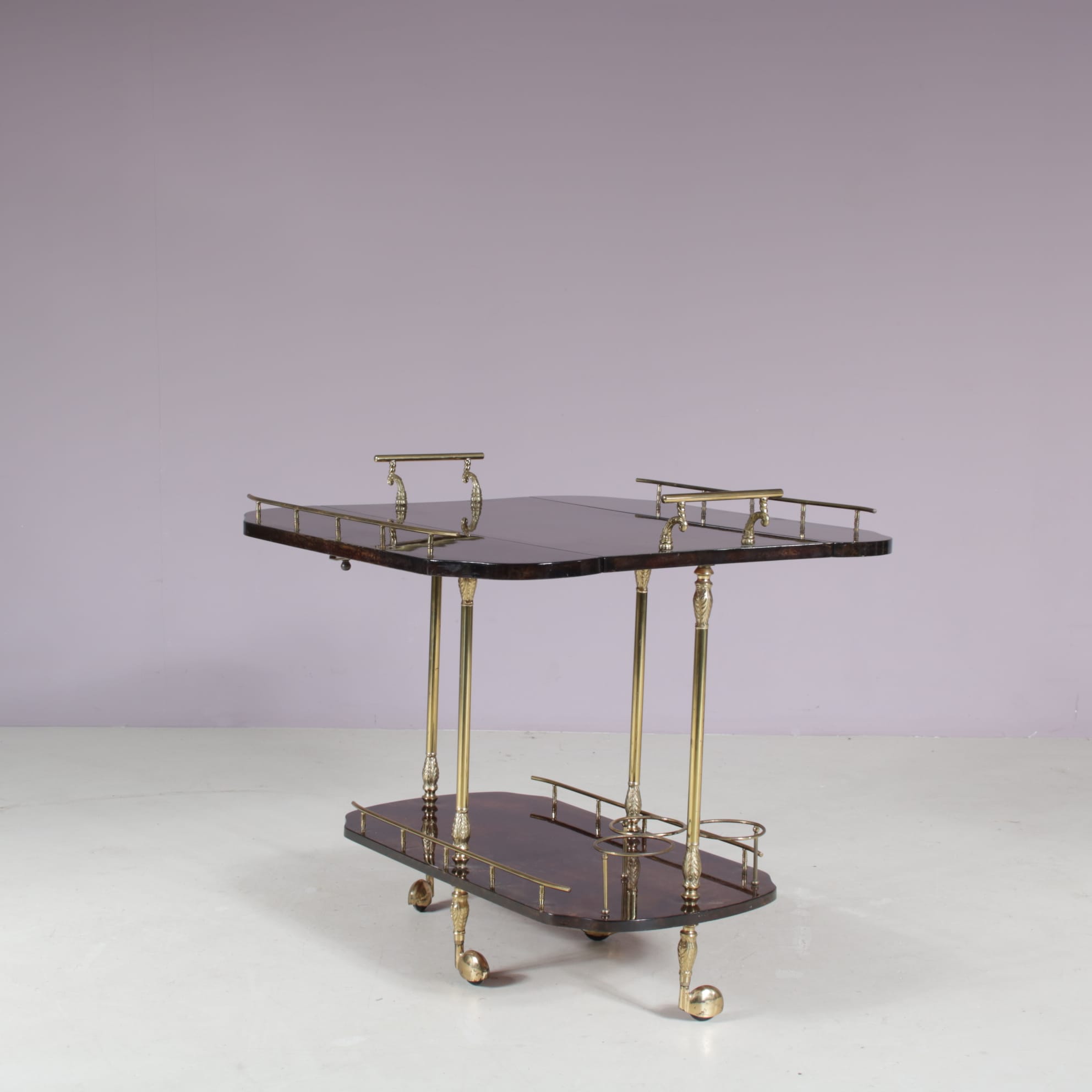An elegant bar cart with drop leaves, designed by Aldo Tura, manufactured in Italy in the 1960s.