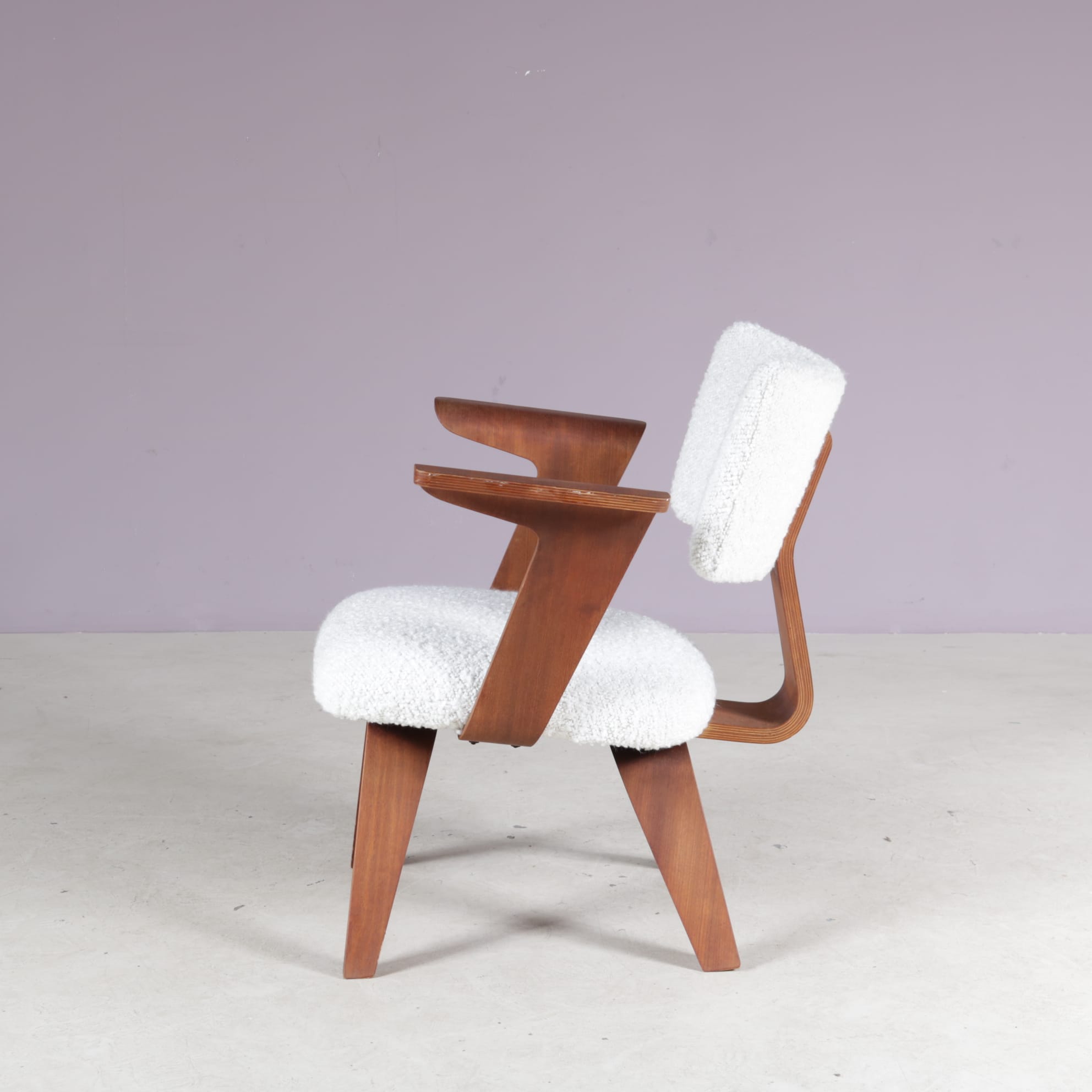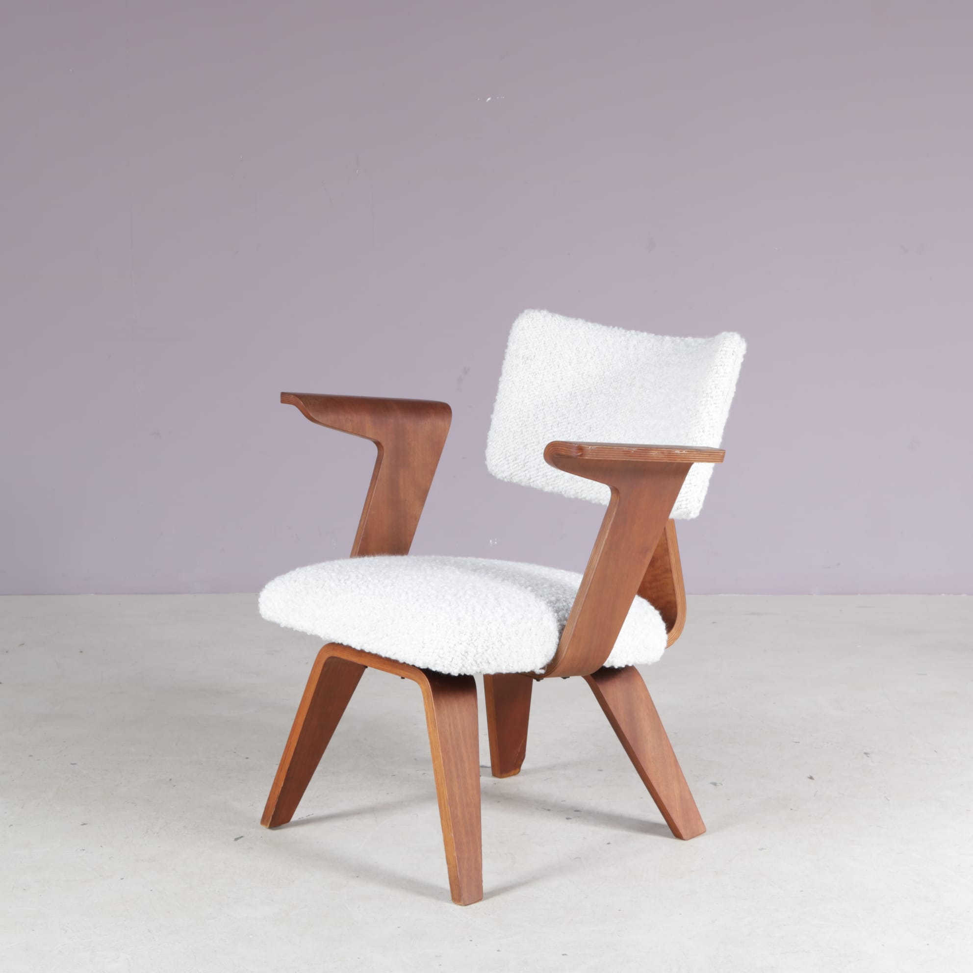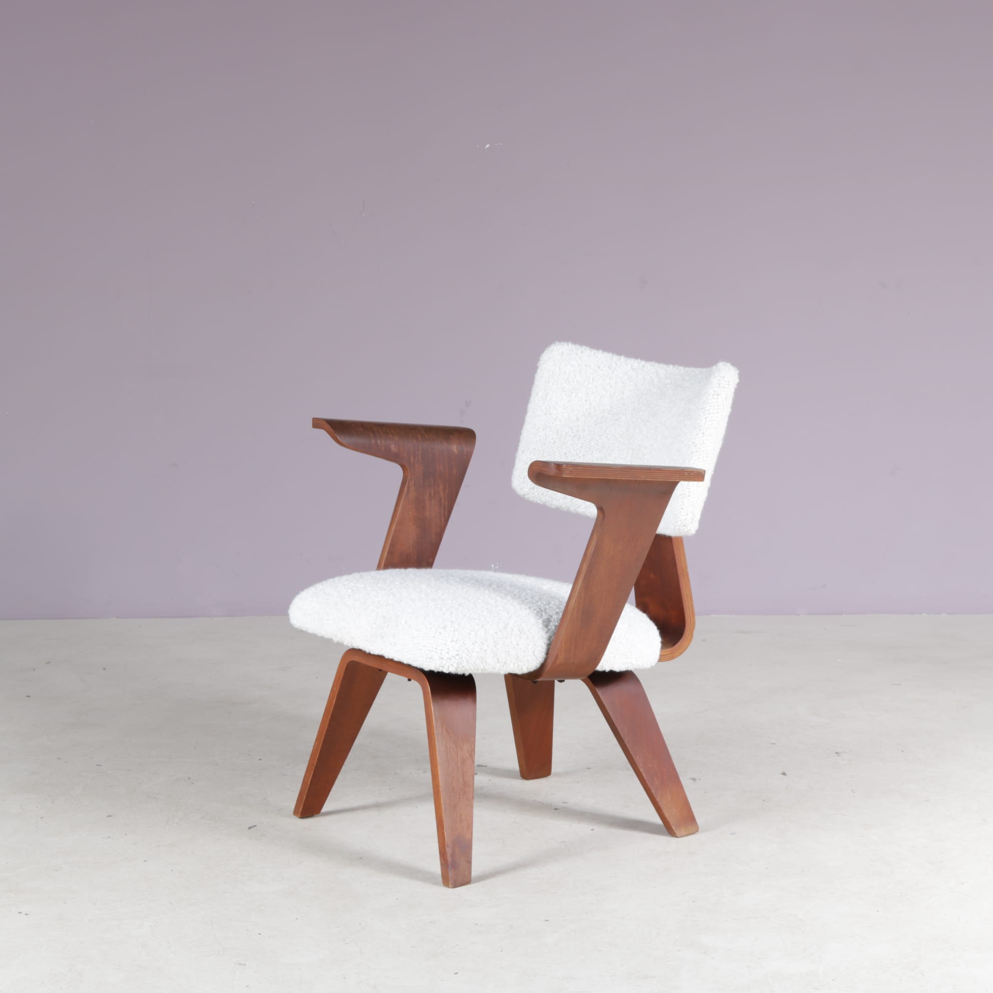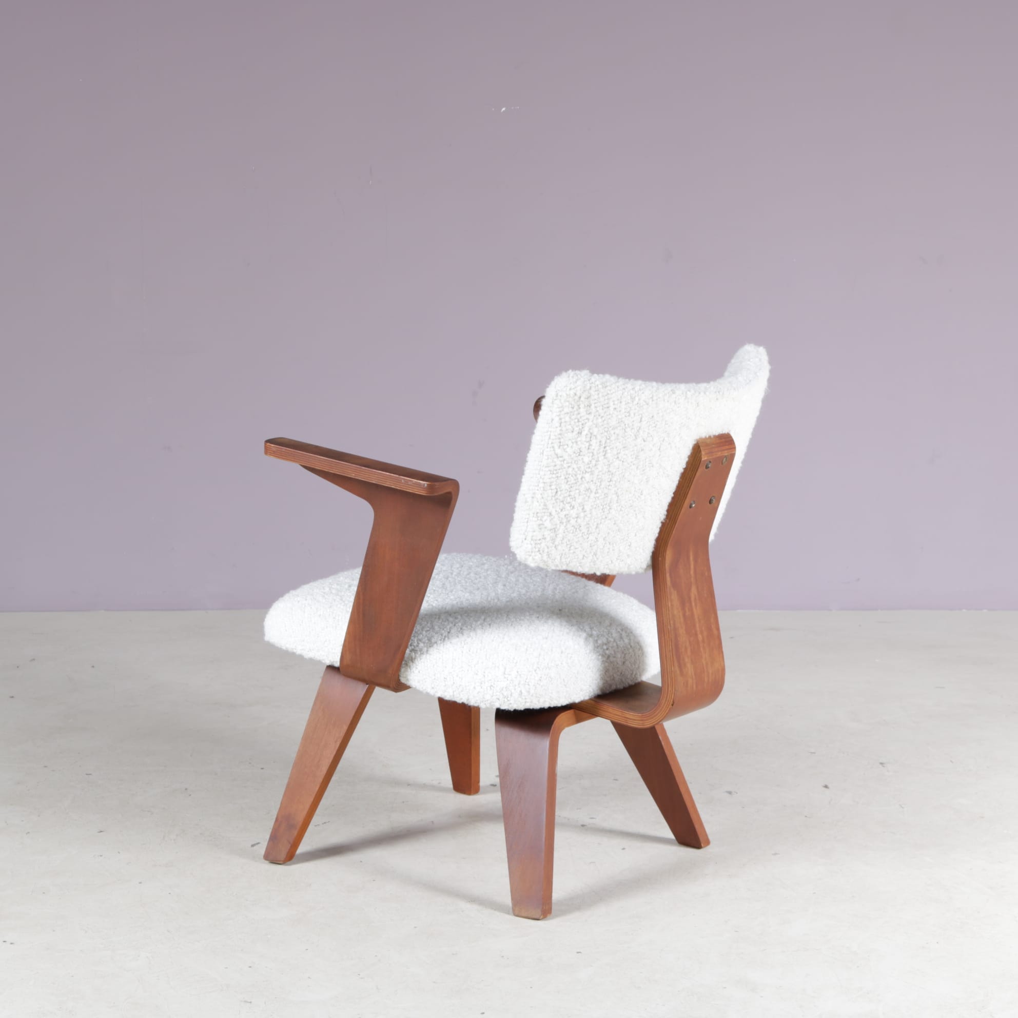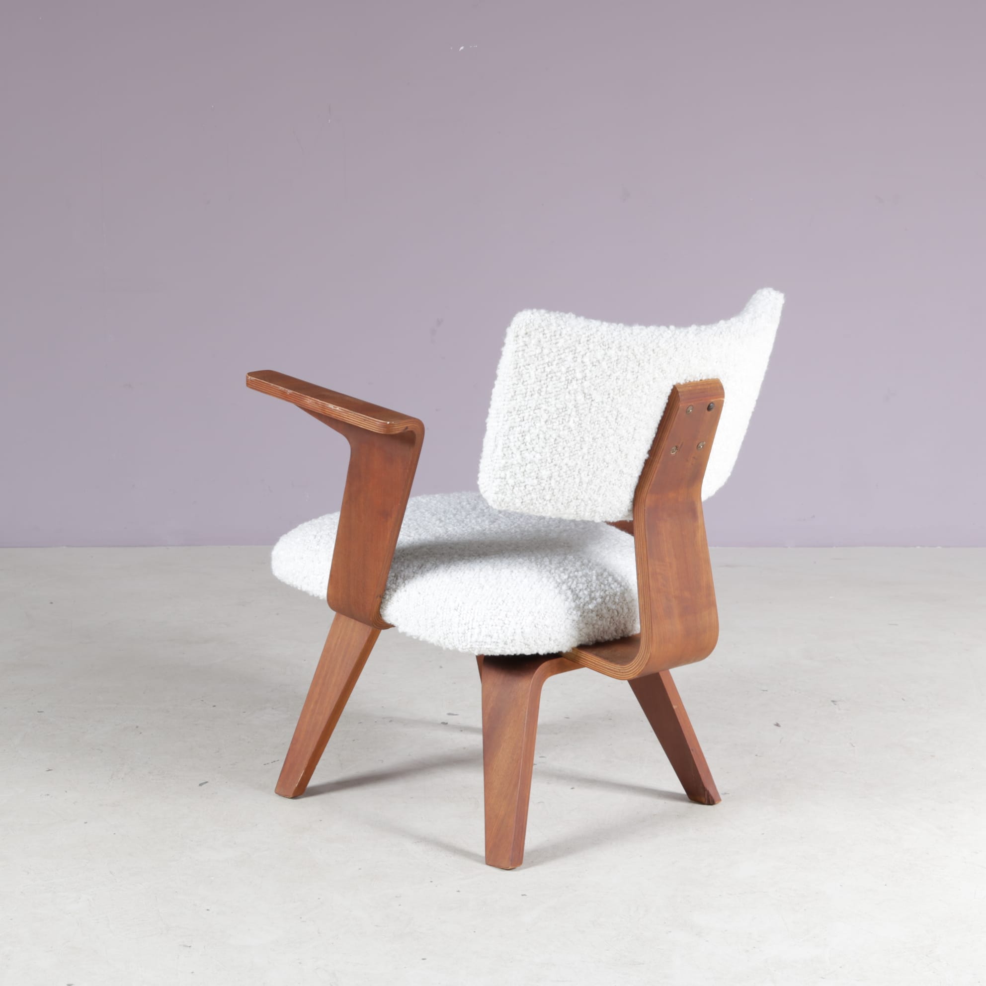 This is a very rare piece of Dutch design with a truly beautiful style! The chair is designed in the eye-catching and iconic Cor Alons style. The plywooden base is made of high quality warm brown wood, gently curved into shape. Newly upholstered in high quality white bouclé fabric that is soft to the touch. The chair combines style with comfort, thanks to the ergonomic design with tall armrests and soft upholstery. An exquisite find of Dutch design!
