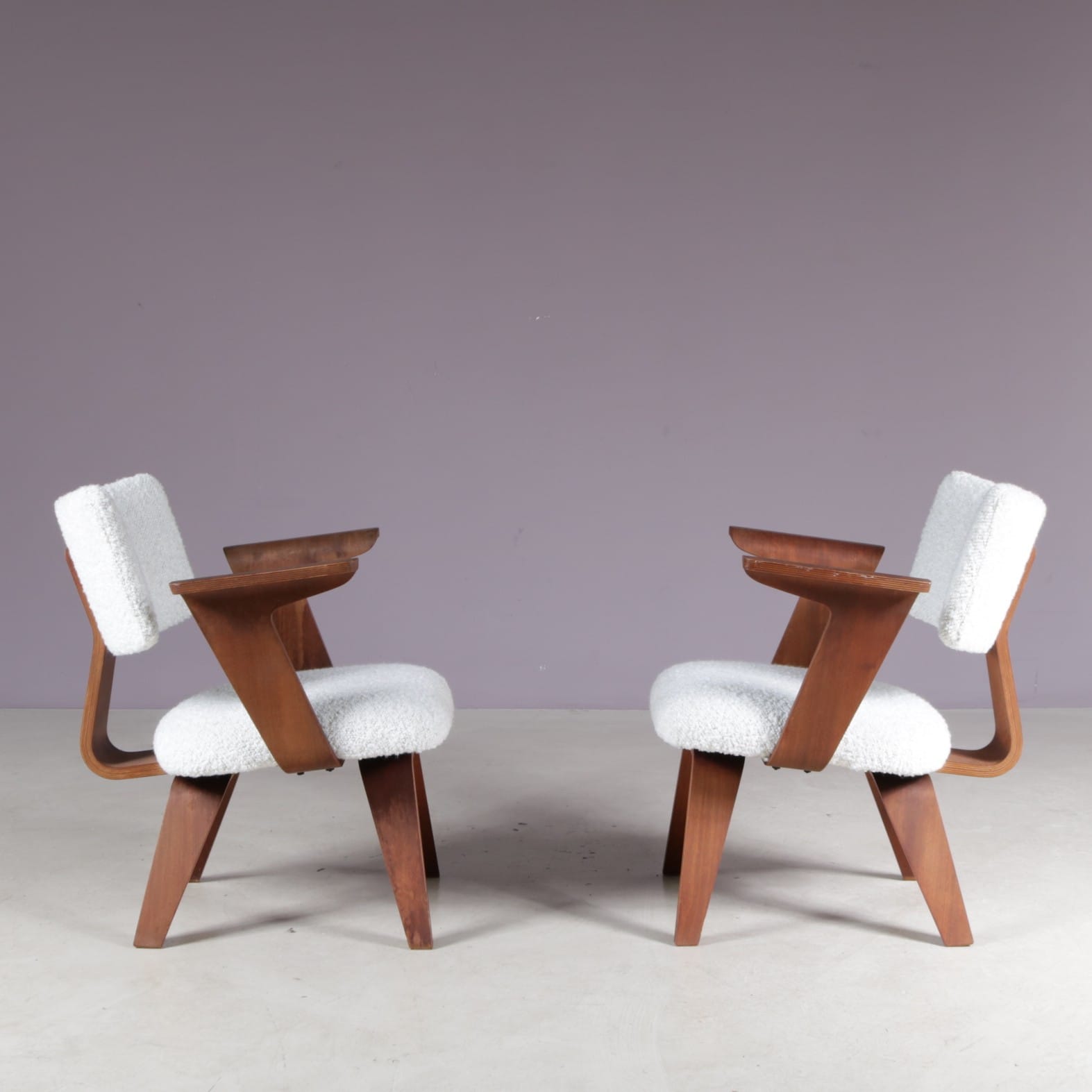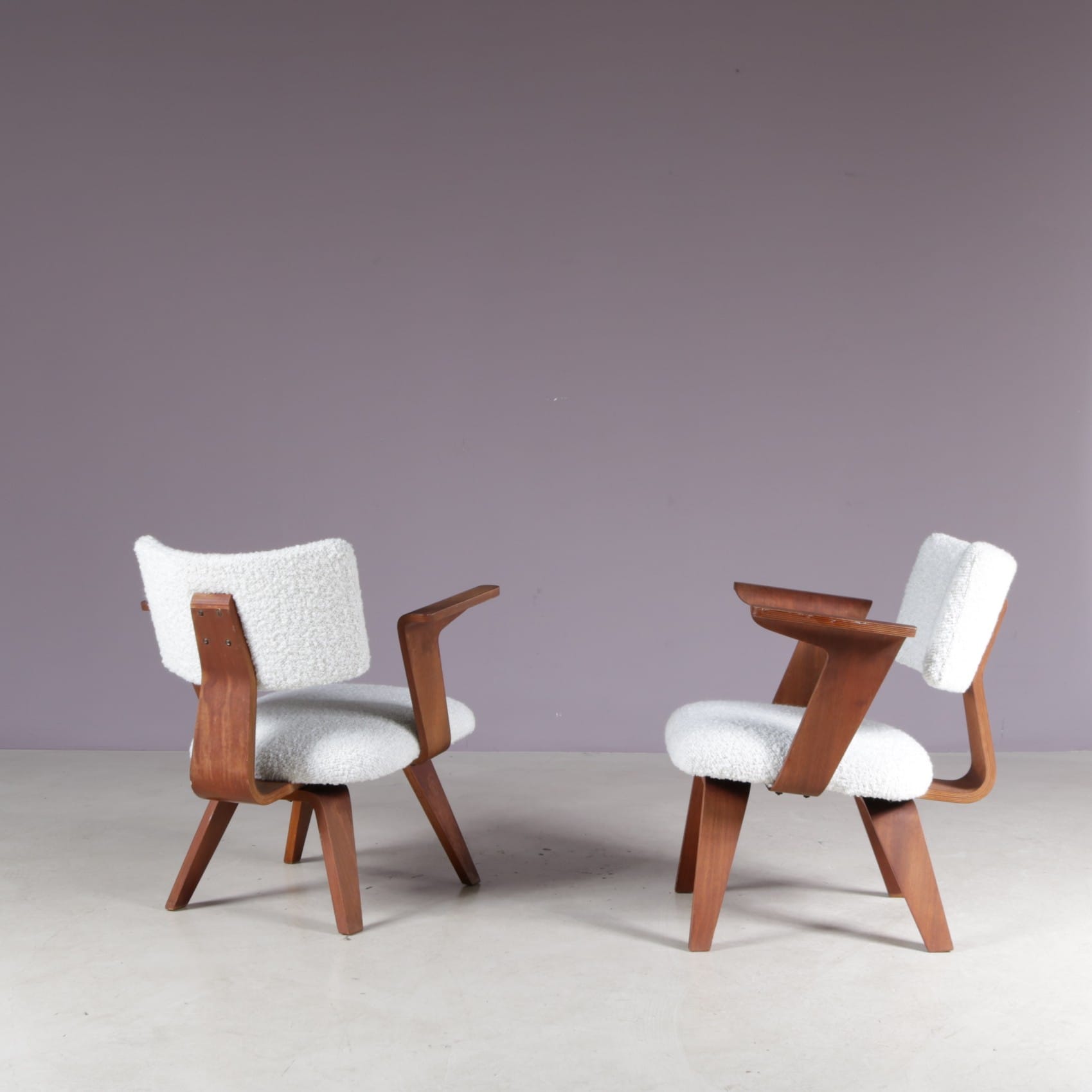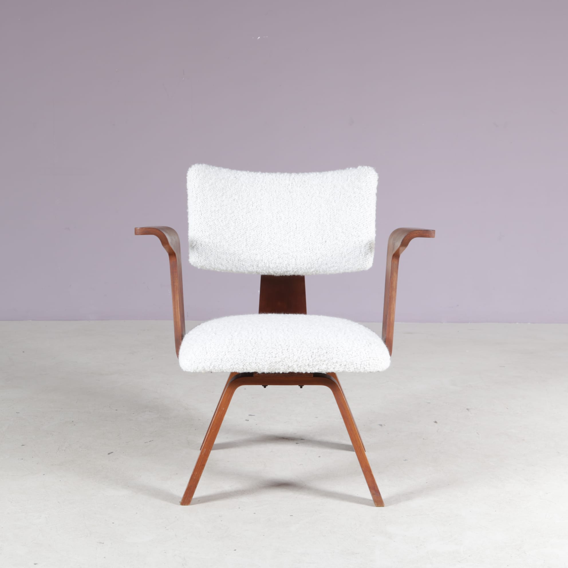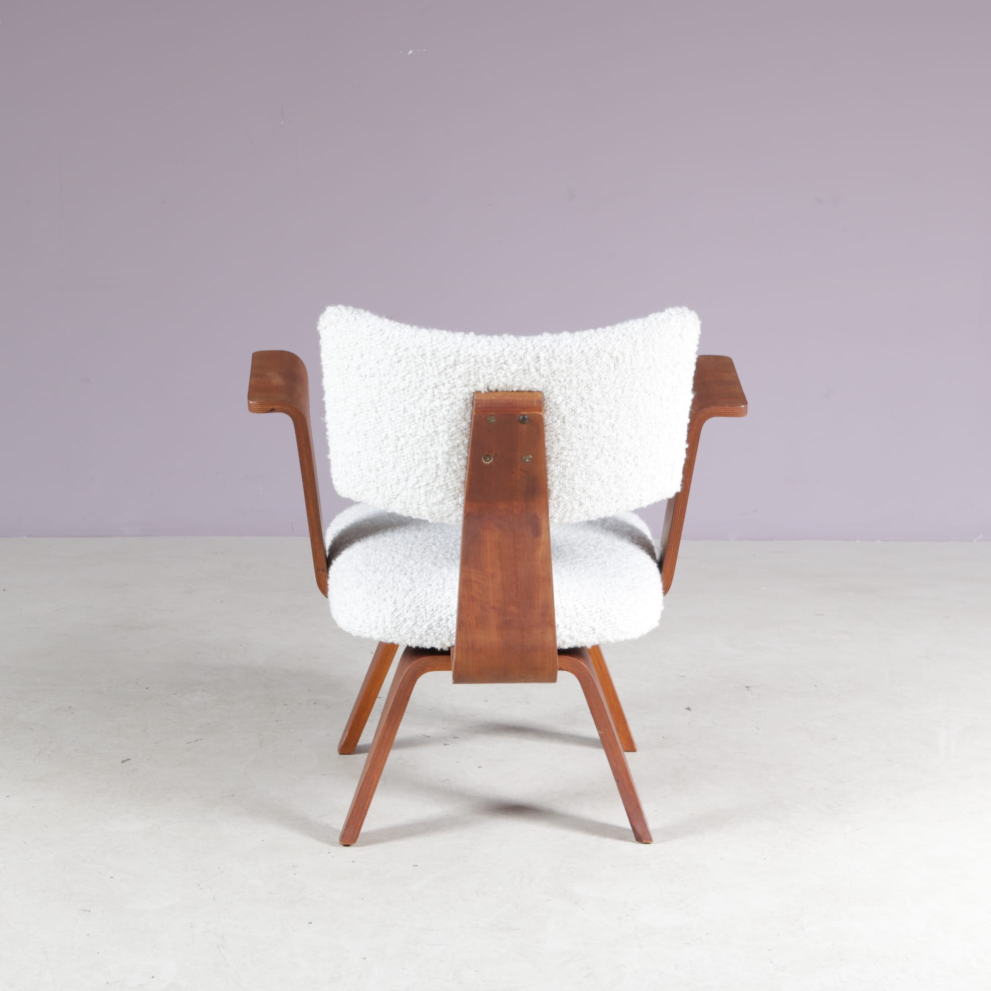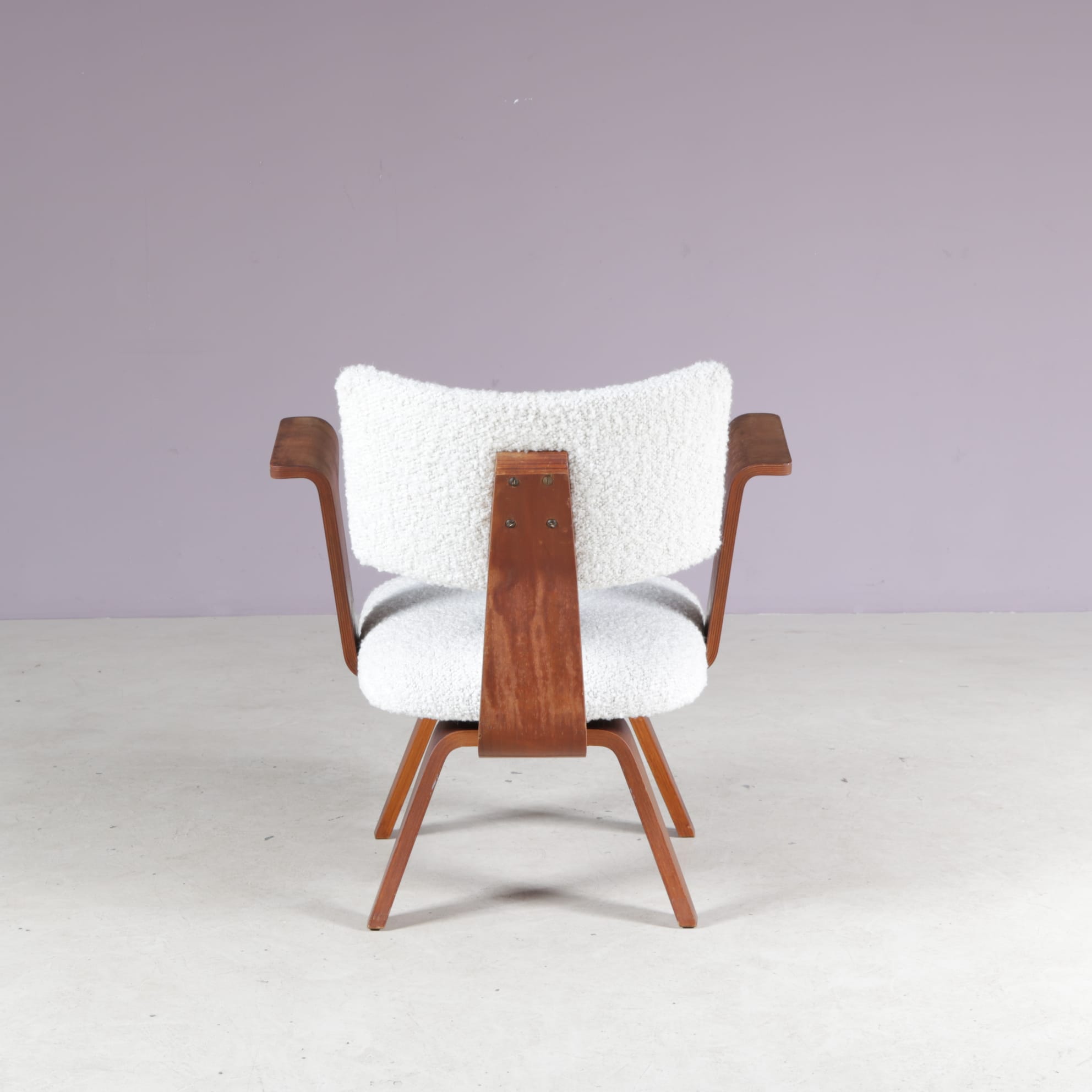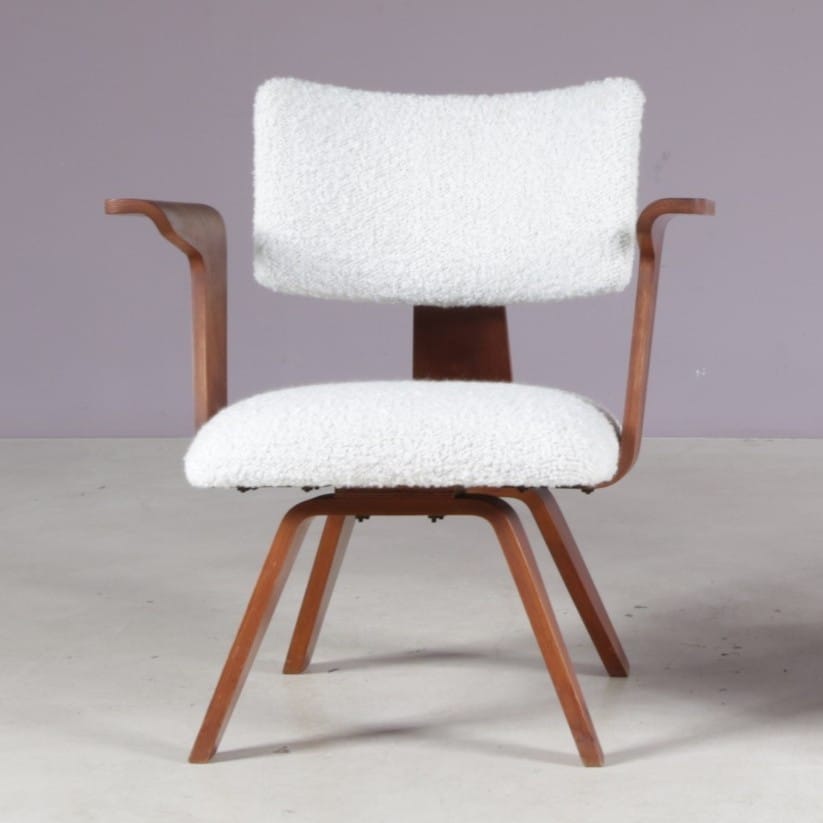 This is a very rare piece of Dutch design with a truly beautiful style! The chair is designed in the eye-catching and iconic Cor Alons style. The plywooden base is made of high quality warm brown wood, gently curved into shape. Newly upholstered in high quality white bouclé fabric that is soft to the touch. The chair combines style with comfort, thanks to the ergonomic design with tall armrests and soft upholstery. An exquisite find of Dutch design!