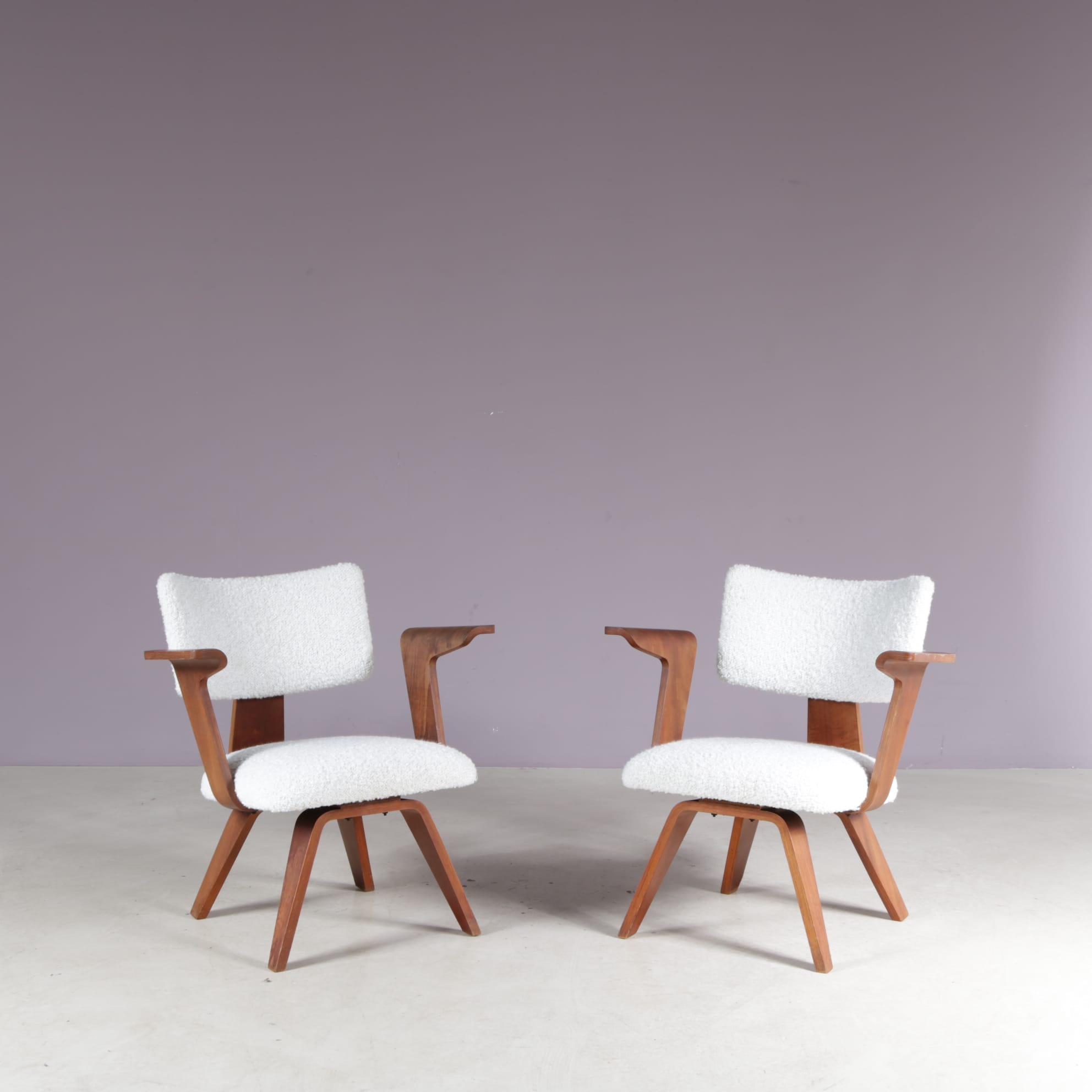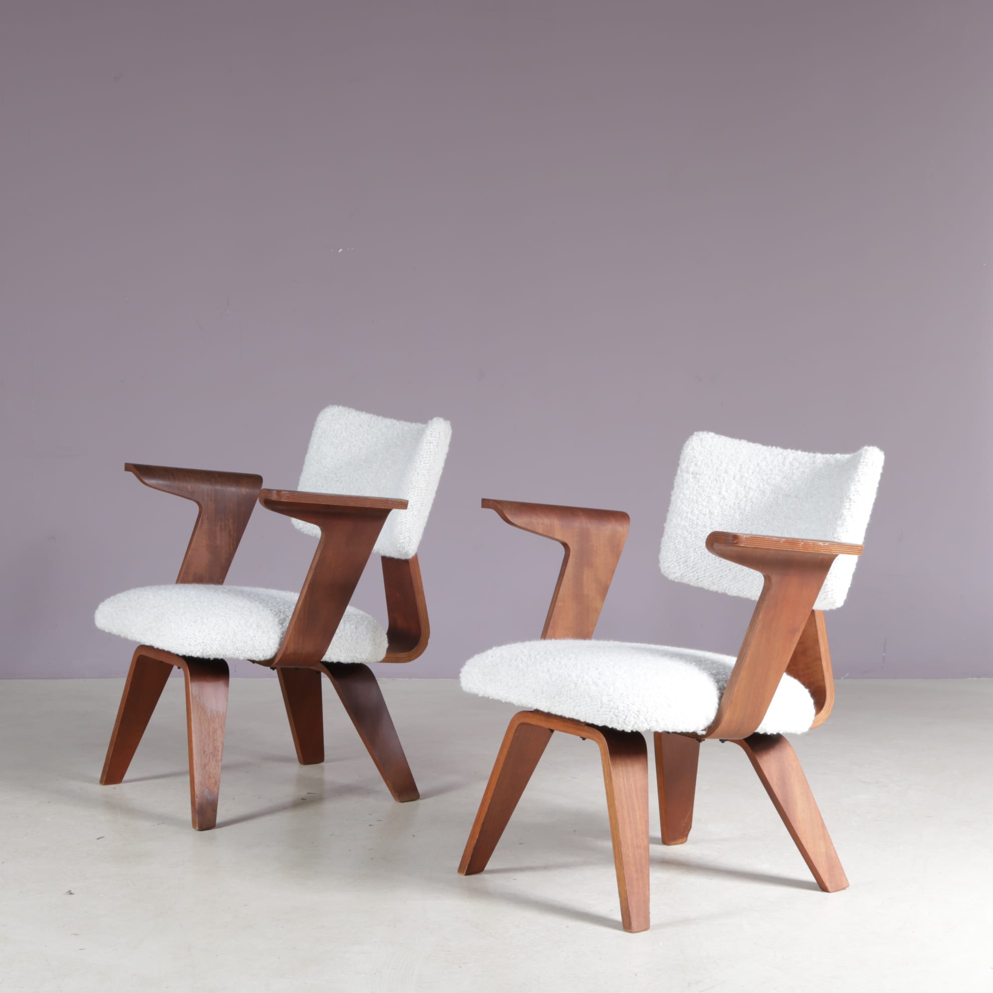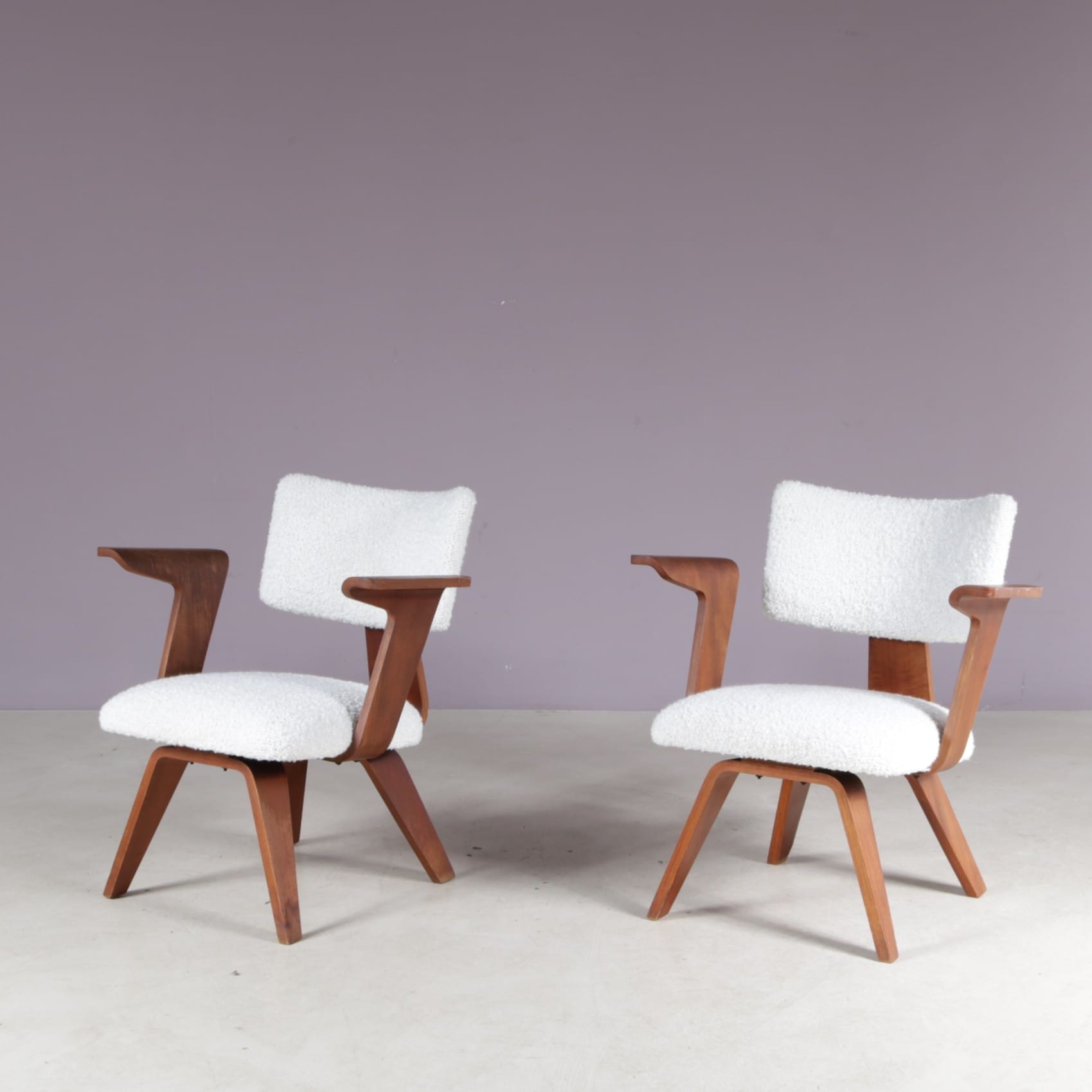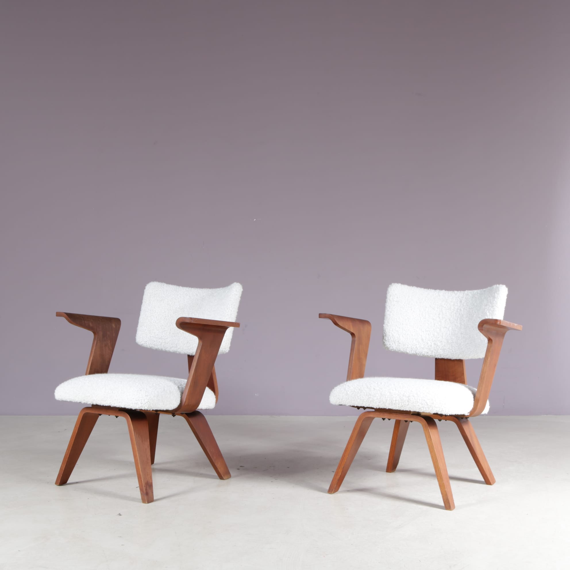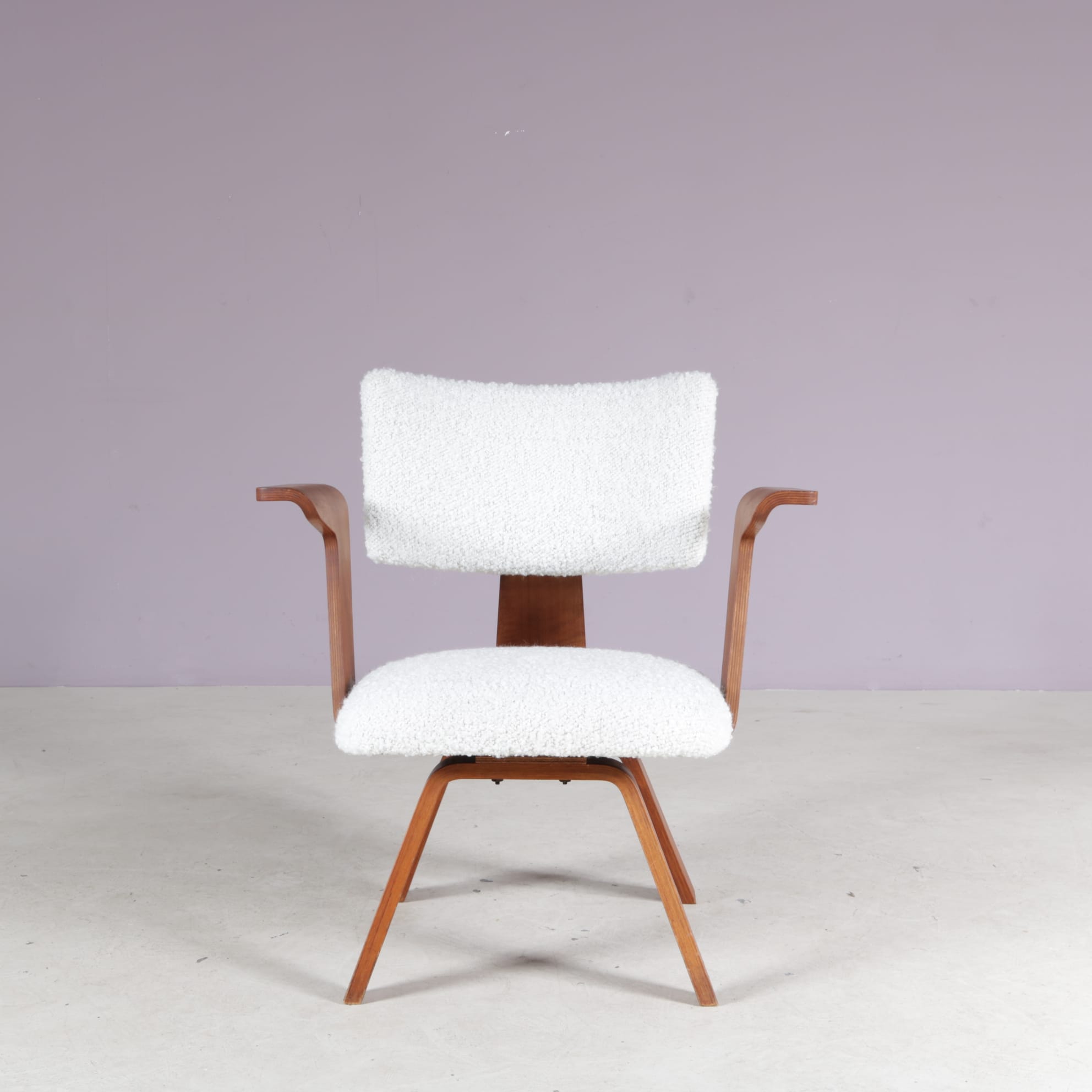 This is a very rare piece of Dutch design with a truly beautiful style! The chair is designed in the eye-catching and iconic Cor Alons style. The plywooden base is made of high quality warm brown wood, gently curved into shape. Newly upholstered in high quality white bouclé fabric that is soft to the touch. The chair combines style with comfort, thanks to the ergonomic design with tall armrests and soft upholstery. An exquisite find of Dutch design!