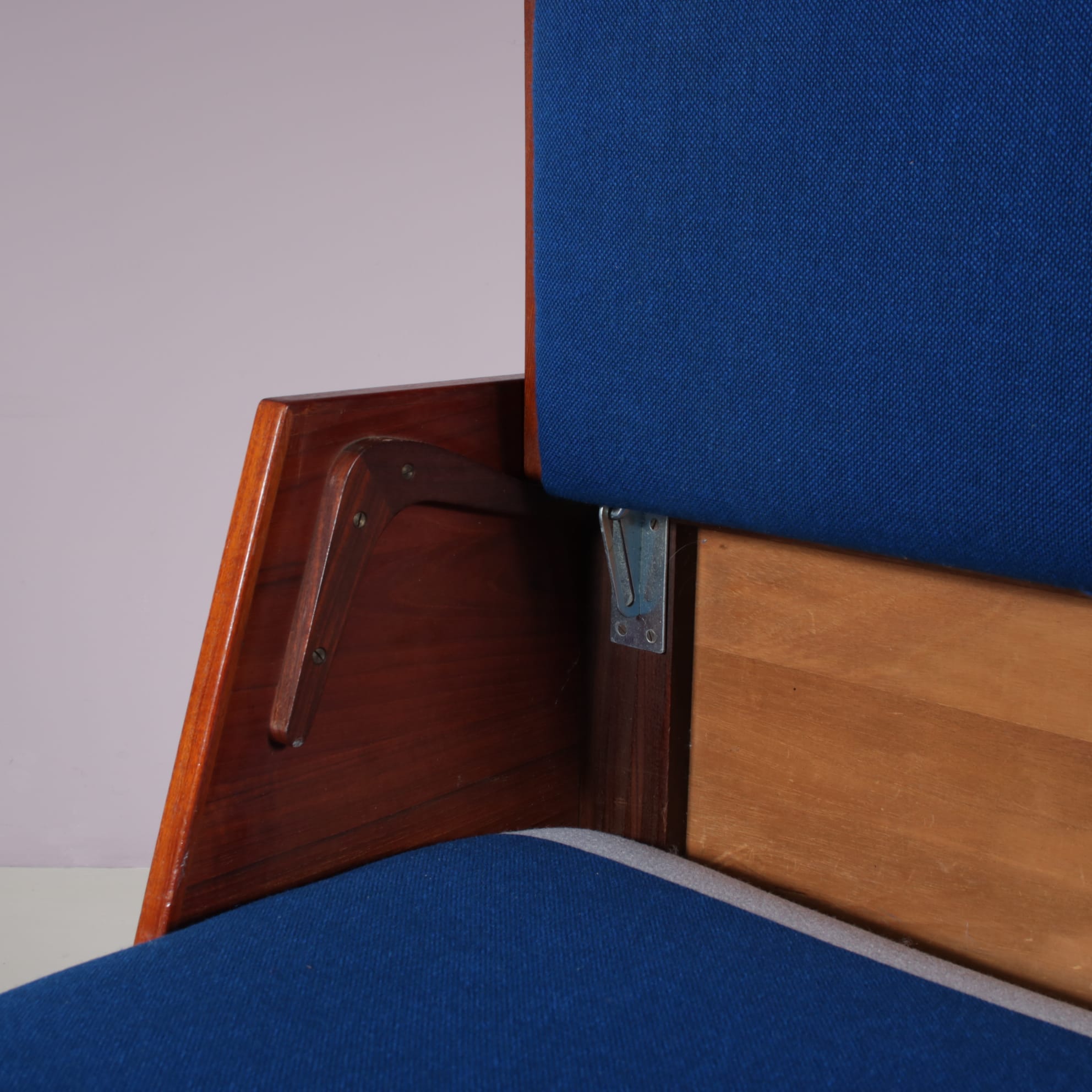 This exceptional sofa is crafted from warm brown teak wood and has been newly upholstered in beautiful blue Kvadrat Hallingdal fabric. The deep blue and warm brown are a fantastic colour combination that adds a modern and luxurious appeal to this eye-catching find. The backrest can be lift up, revealing a small storage space as well as adding the depth to the seat which turns the sofa into a guest bed. A rare and versatile piece that will enhance any interior!