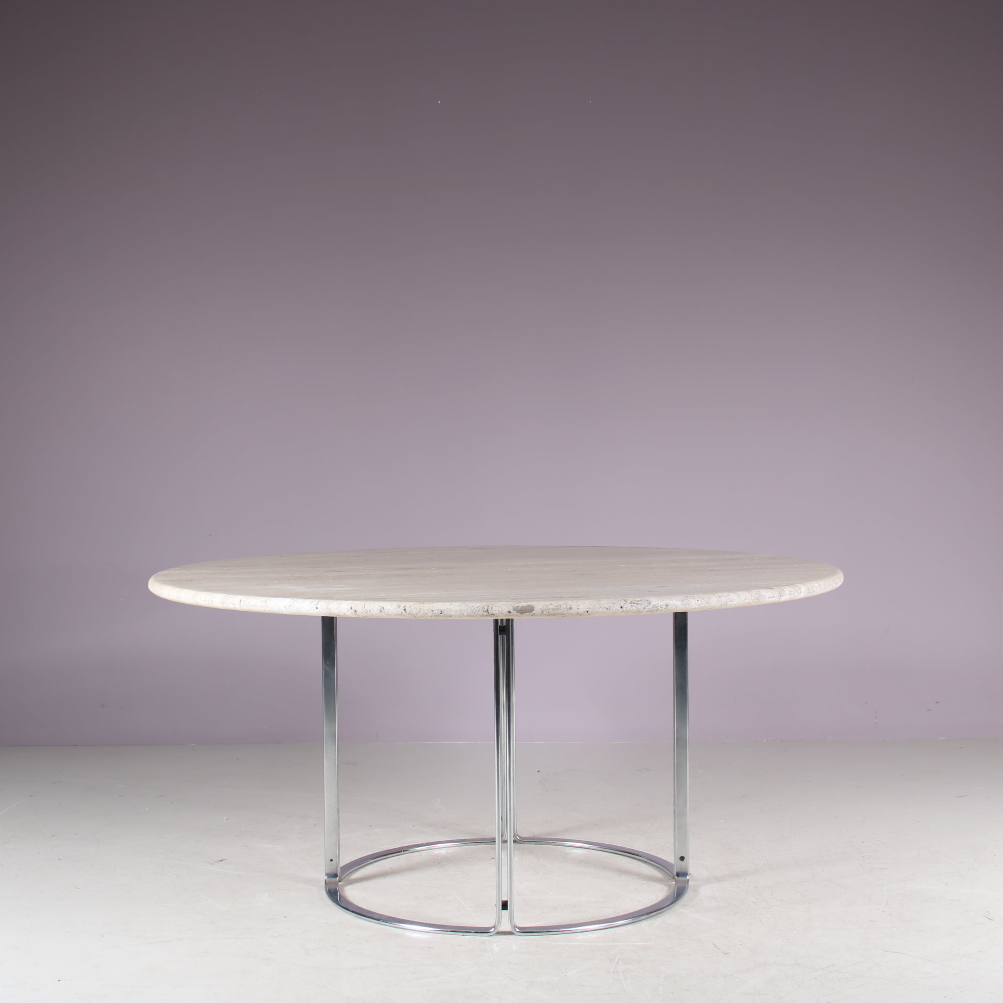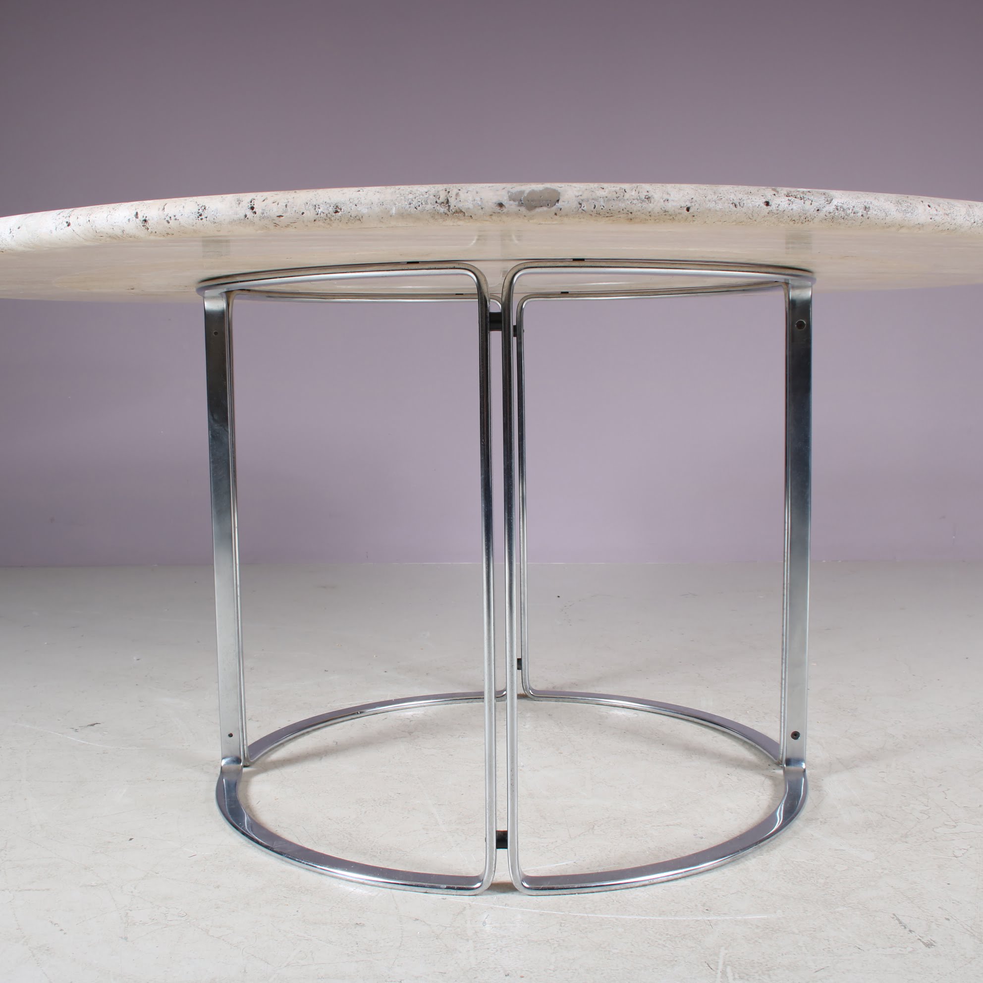 This high quality piece features a chrome plated metal base with a large round travertin top. The metal base is really nicely made, bent into shape and beautifully made of different elements, nicely connected into a smooth shape. This structure creates a round foot and support with straight legs in between. All together this is a truly eye-catching piece of mid-century design that will make a fantastic eye-catcher in any interior!