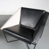 The chairs have black lacuqered tubular metal bases in nice geometric shapes. These shapes are brought back in the design of the seat, that has several panels in trapezium and triangle shapes. The chairs are white and black skai upholstered, both having one armrest in the colour of the other, making it a unique and eye-catching set that truly compliments eachother!