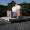 This is one of the sculptures that was made for primary school “De Kaap” in the Netherlands. They were designed in the shape as sitting persons (without heads), each with their own clothes, figure and size. The use of colourful frosted ceramics makes the pieces fun and decorative, true eye-catchers to the outdor space!