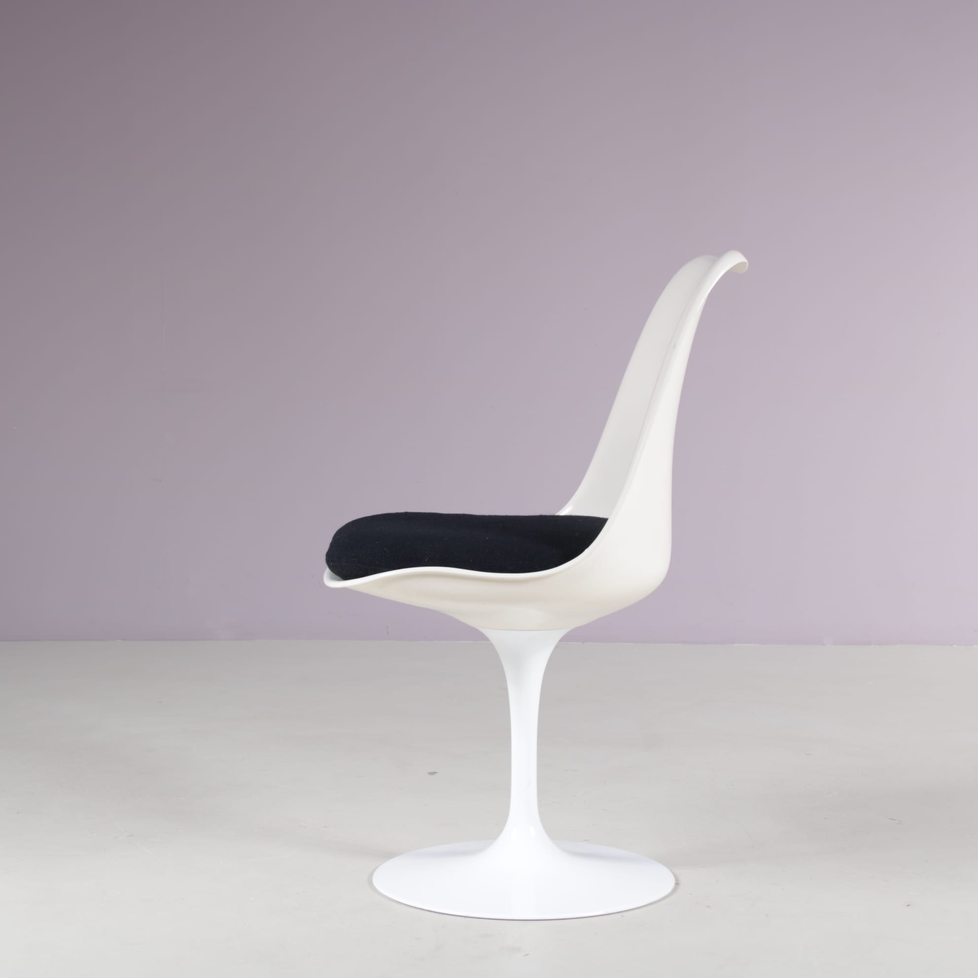 These iconic chairs have beautiful and elegant minimalist tulip bases in white coated aluminum, which creates an eye-catching contrast with the black fabric upholstered cushions. The curved finish to the backrest together with the soft cushioning ensures a most comfortable seating experience. Saarinen’s Tulip Chair is a true design classic and a testament to his innovative approach to furniture design. The chair’s sculptural silhouette and modern materials make it a perfect fit for any interior looking for something special!